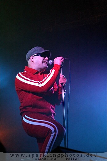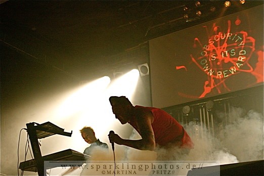 Zu den elektronischen Klängen des Duos Decoded Feedback kommt auch eine Gitarre mit ins Spiel. Der Sound wird härter und der Gesang mit einer ordentlichen Portion Hall überzogen. Das Etikett: „Herkunftsland- Kanada“ ist gut erkennbar. Auch zur Musik von Decoded Feedback flimmern unzählige Videosequenzen wie eine bunte Zuckerschicht über die Leinwand. Mit oder ohne Gitarre steht Marco Biagiotti an vorderster Front, seine blonde Kollegin bedient im faden Neonlicht sorgfältig die Tasten des Synthies. Im Publikum ist Bewegen angesagt. Zu dem kraftvollen elektronischen Sound wird es eine leichte Aufgabe die Anwesenden während der noch nicht beendeten Frühjahrsmüdigkeits- Phase fit zu machen. Das aktuelle Album „Aftermath“ und Konsorten sind Anlass genug, um sich zum dumpfen Rhythmus den Schlaf aus den Augen zu reiben.