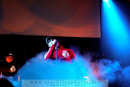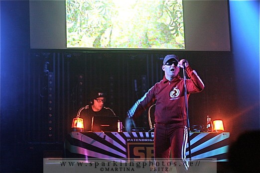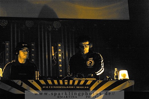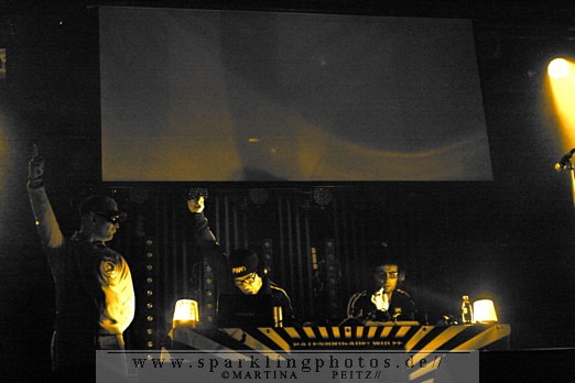 Es ist vor 20 Uhr als Patenbrigade: Wolff aus Strom geschmeidige Beats machen. Fast verdeckt stehen Sven Wolff und Lance Murdock hinter ihrem Musikpult auf dem sich das elektronische Equipment der Soundkünstler befindet. Nur das grell gelbe Licht einiger Bauleuchten sticht aus der Dunkelheit hervor. Neben dem Pult steht ein dritter Mann und wartet auf seinen Einsatz. Oft tritt der Sänger nicht ins Licht denn die meisten Songs der Ost-Berliner bauen sich aus instrumentalen Elementen zusammen. Doch wenn nach einer Stimme verlangt wird, stellt sich der Herr im roten Synthetik-Jogger ins Rampenlicht. Eine Kappe ist tief in die Stirn gezogen, die Sonnenbrille passt gerade noch darunter, so als möchte sich der Sänger hinter einer Maske verstecken Der Gesang knistert zur Musik, auf einer Leinwand im Hintergrund laufen dazu Videos aus DDR Zeiten. Mit ihrem ungewöhnlichen Auftritt können sie nicht jeden im Publikum überzeugen, aber vielleicht gelingt es dem kanadischen Musikprojekt Decoded Feedback besser.