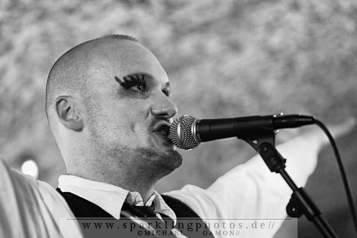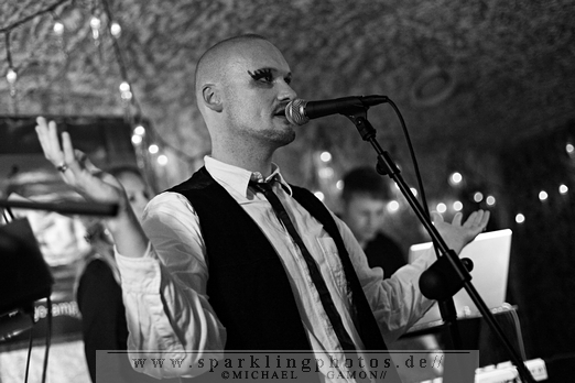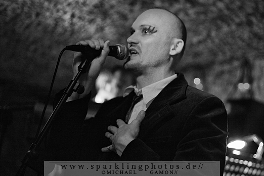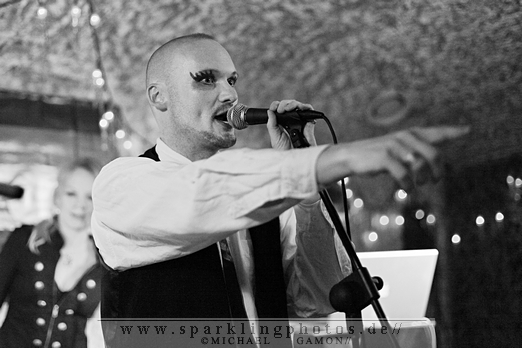 Backingvocals von Jane Overnight lassen das Filmszenario des EGOamp-Kosmoses noch realer erscheinen. Das Set bestand natürlich aus Songs des Debütalbums; neben der Eigeninterpretation des Underground Klassikers „The Cabinet“ gab es aber auch noch das Trio Cover „Jajaja“ zu hören, das in der EGOamp Version komplett neu überarbeitet wurde und für viel Stimmung sorgt. Düstere Waveeinschläge bestimmen das einnehmende „The Camera“, bei dem Frontmann Asmodi Caligari den Hauch der Achtziger einatmet und sich beschwörend ans Publikum wendet. Den Schlusspunkt setzten das von vielen Samplerbeiträgen bekannte „The Cabinet“ und das großartige „Egomanic Maniacs“, bevor die Band wieder in die Realität hineintrat und noch einige Exemplare ihrer Limited Tour Edition des Debütalbums verkaufte und auf der Bühne Incubite ihren Fans die Möglichkeit zum ausgiebigen Tanzen gaben.
