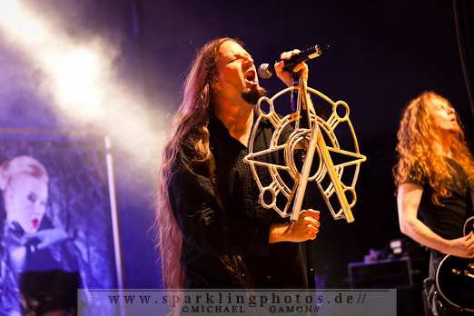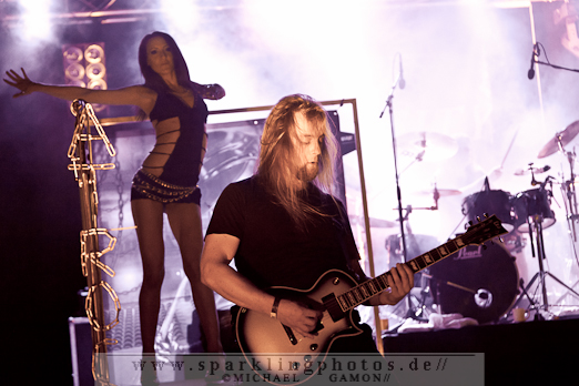 Und mit dem Camouflage Cover „The Great Commandment“ ging es nach einem atmosphärischen Intro auch direkt los. Der langhaarige Frontmann sang aus tiefstem Leibe ins Mikro und öffnete immer wieder die Arme, so als würde er etwas predigen. Im Hintergrund tanzten zwei gut aussehende, junge Damen auf erhöhten Tanzflächen und untermalten die Songs mit ihren Bewegungen passend. Immer wieder sprach Alexander auch zur Menge, forderte sie zum Jubeln und Mitfeiern auf und tatsächlich wurde die Stimmung bei Songs wie „Die Todgeweihten“, zu welchem Liv Kristine die Backgroundvocals beisteuerte, oder dem Cover von And One’s „Deutschmaschine“ immer ausgelassener. Eine tolle, unterhaltsame Show und ein phantastischer Abschluss des zweiten Festivaltags – zumindest auf der großen Bühne.