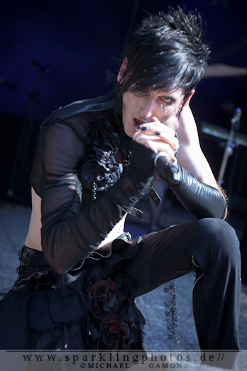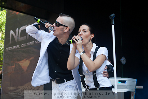 Da wir in unserem Zeitplan durch das Stromproblem nun etwas zurück hingen, gab es nun die erste Überschneidung. Denn noch als Psyche den Fans vor der großen Bühne einheizten, starteten auf der kleinen Bühne Sensory Gate mit ihrem Auftritt. Die 2004 gegründete Band – bestehend aus Andrea Pozzi und Max Iannuzzelli – weiß wie keine andere, verschiedene Stilrichtungen der Szenemusik zu kombinieren und sie in eine individuelle, mitreißende und beeindruckende Form zu bringen. Auf Sensory Gate hatten wir uns ganz besonders gefreut, überzeugte uns das italienisch- deutsche Musikprojekt nicht nur mit ihrem starken Debutalbum „Ianus“, sondern lieferten sie auf dem vergangenen NCN auch einen solch beeindruckenden Auftritt ab, dass sie kurzerhand von den Fans zur besten Newcomer- Band des NCN 2010 gewählt wurden. Verdienterweise sollte ihr Auftritt aus diesem Grund beim diesjährigen NCN auch wesentlich später in der Running Order stattfinden.