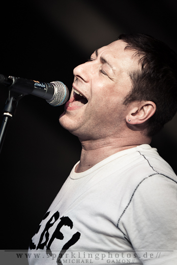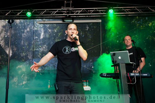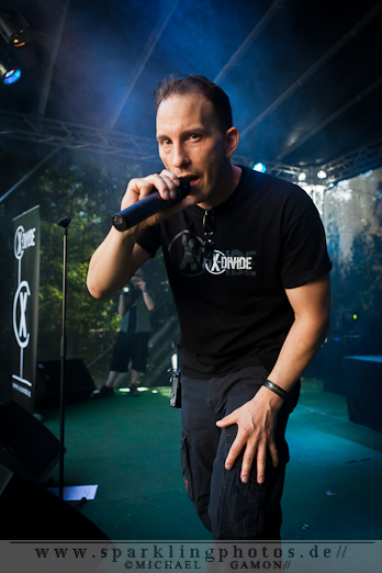 Mit geschmeidigem Synthiepop ging es nun auf der kleinen Bühne weiter mit X- Divide. Das Duo, bestehend aus Jens ( Management, Live Keys, second Vocals) und Eric (Vocals), wurde 2005 gegründet und stellte sich nach und nach immer mehr als super Insidertipp heraus. Sowohl Eric als auch Jens sind schon lange keine Anfänger mehr auf ihrem Gebiet, hatten doch beide schon vor der Gründung der Band unabhängig voneinander Bühnenluft geschnuppert. Und genau diese Erfahrung merkt man den beiden auch an, wenn man sie auf der Bühne performen sieht. Vom Anfang bis zum Ende saß wirklich jeder Ton und alles war aufeinander abgestimmt. Und nicht nur das war entscheidend, denn das, was da von der Bühne schallte, machte der Band auch sichtlich Spaß. Leider hatte das Publikum ein kleines Mittagstief, so dass Eric die Menge immer mal wieder etwas anfeuern musste. Nachdem sich aber doch bereits einige Fans bei Songs wie „Sympathy“ oder „So In Love“ warm getanzt hatten, gab es für viele bei einem ausgedehnten, abschließenden Namnambulu- Medley keine stillen Beine mehr. Ein schöner Auftritt, der in meinen Augen an diesem Tag ein bisschen zu wenig Beachtung erhielt.