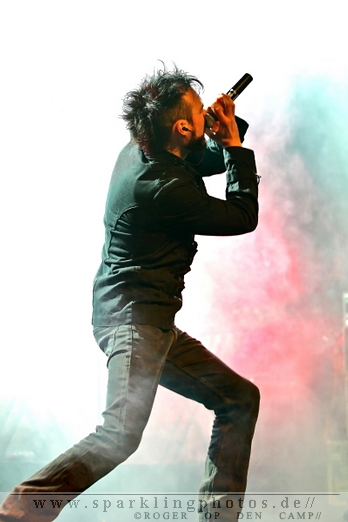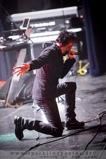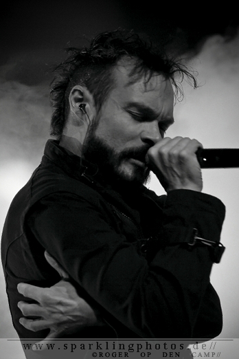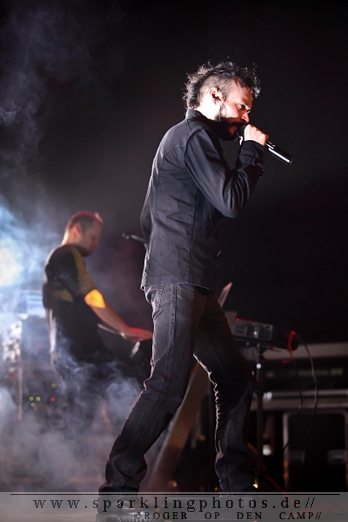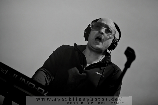 “Shout It Out” erklang es durch den ganzen Saal und das Publikum folgte. Nach “Moldavia” konnte man die Atmosphäre nicht mehr besser beschreiben als mit den Songlyrics “Now start to move and dance. Now start to groove in trance” – Und alle taten wie befohlen! Die Party war nun unaufhaltbar, auch ein defektes Mikrofon konnte Front 242 nicht stoppen und wurde einfach zusammen mit Mikrofonständer von der Bühne katapultiert. Viele bekannte Songs wie “Master Hit” oder “No Shuffle” folgten bevor bei “Headhunter” endgültig die Hölle losbrach. Man konnte den Holzboden der Halle sprichwörtlich auf und ab hüpfen spüren und eine Renovierung der ersten Etage schien nach dem Gig fast unausweichlich. 30 Jahre Bühnenerfahrung und trotzdem sind sie noch in der Lage eine solche Intensität abzuliefern: Hut ab Front 242, ihr ward, seid und bleibt die Godfathers Of EBM!