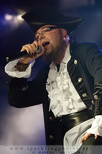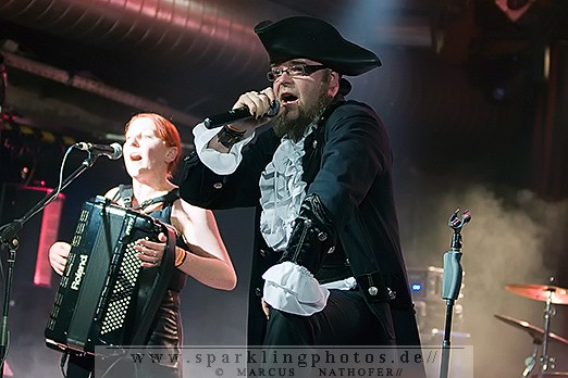 Die Zuhörerschaft sollte nicht lange warten, pünktlich um 20.00 h sprangen Punch’n‘Judy auf die Bühne. Punch’n‘Judy das sind Sascha (vocals), Ute (Akkordeon und Beigesang), Peter (Gitarre und Beigesang), Stefan (Bass und Beigesang) und Vloh (Schlagzeug und Beigesang). Bereits 2005 erschien ihr Debütalbum „spring!time“. Aktuell bringen die fünf ihr drittes Album mit das „Live“ heraus. Auf der Homepage der Band beschreiben sie ihre Musik und ihren Stil schlicht und einfach als Crossoverfolk aus dem Ruhrgebiet. Doch schon nach den ersten Beats wurde jedoch klar, dass hinter dieser Band viel mehr steckt. Der Laden tobte und die fünf tobten auf der Bühne. Ob im Piratenoutfit, in einem militärisch angehauchten Jackett oder aber mit Umhang und Vampirzähnen ausgerüstet, Punch’n’Judy sprühten vor Energie und gaben eine Menge davon weiter ins Publikum. „Verdammte scheiße, geil!“ war die Aussage von Sänger Sascha, auf die Zustimmung des Publikums. Kurzerhand stieg er von der Bühne und kletterte auf die Absperrung des Grabens um den Fans noch näher sein zu können. Im nächsten Moment jagte die Band aber schon wieder über die Bühne hintereinander her, während sie kraftvoll ihre Songs vortrugen.