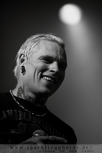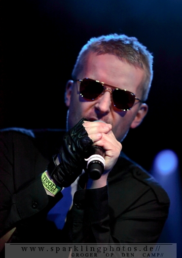 Sie beginnen ihren Set nach einer kurzen Zeit, wobei die beiden komplett schwarz gekleidet sind und dazu weiße Krawatten tragen. Nach einer kurzen Einleitung bei der wir erfahren, dass sie aus Norwegen stammen und einen Drummer suchen, geht es mit „Catch Me“ von ihrer bisher einzigen CD „Grind It Down“ los. Später während des Icon Of Coil Auftritts werden wir noch näher mit ihnen sprechen. Der Sound beim Auftritt ist gut und man bedient sich einer Menge gedämpft klingender Synthiesounds. Dem Eröffnungstrack folgt ein neuer Song, der deutlich poppiger ausfällt und irgendwie wirkt alles als würde es dreidimensional erklingen, was den Effekt angenehm erhöht. Auch wenn der Saal bisher kaum gefüllt ist, gibt der Sänger alles und hält die Zuschauer bei Laune. Es ist sicher nicht einfach in einer fast leeren Halle zu spielen, doch zum Glück füllt sich der Saal während des Gigs immer weiter und man überzeugt auch mit dem dritten Song „Adrenaline“. Einige Songs später endet der Auftritt, während ein paar Synthsounds noch weiter erklingen und das war sie dann also, die erste flüchtige Begegnung mit Substaat und diese hat sich gelohnt. Nachdem sie sich frisch gemacht haben, kommen die beiden noch in den Zuschauerraum und wir unterhalten uns ein wenig, wobei wir erfahren, welche Konzerte noch anstehen, dass sie zuvor zu dritt waren, ihr Drummer aber aus Zeitgründen aussteigen müssen und dass sie nach Ersatz suchen. Also ihr Schlagzeuger dort draußen, bewerben! Im Mai erscheint bei Danse Macabre eine Single, ein komplett neues Album ist für Ende des Jahres geplant. Ihr erstes Album ist als Doppel-CD erschienen, wobei CD2 Remixes der Songs von CD1 enthält.