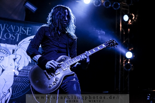 Nach gut einer halben Stunde Umbauphase ist es dann endlich so weit. Unter dem Jubel der mittlerweile doch recht gut gefüllten, aber nicht ausverkauften Essigfabrik entern Drummer Adrian Erlandsson, die Gitarristen Greg Macintosh und Aaron Aedy, sowie Bassist Steve Edmondson die Bühne. Zu den ersten Klängen von „Widow“ erscheint dann auch Sänger Nick Holmes, der anfangs mit Mikro Problemen zu kämpfen hat und viel zu leise ist. Nach dem zweiten Song „Honesty In Death“, der ersten Singleauskopplung vom neuen Album sind die Probleme zwar behoben, dennoch bleibt der Gesang während des gesamten Gigs stellenweise leider viel zu leise. Vor allem bei den älteren Songs fehlt Holmes mittlerweile die Stimmkraft um den Gesangspart andruckvoll rüber zu bringen – aber der Mann wird ja auch nicht jünger. Den treuen Fans macht dies jedoch nichts aus, bei „Erased“ und „Forever Failure“ singt das Publikum lauthals mit und spätestens bei „As I Die“ dem Bonustrack des 1992er Albums „Shades Of God“ bildet sich sogar ein kleiner Moshpit. Während Frontmann Nick Holmes sich bei seinen Ansagen auf Titel und Album des nächsten Songs beschränkt sieht man vor allem Aaron Aedy die enorme Spielfreude an. Immer in Bewegung und stets lächelnd, greift er nach jedem Stück nach seinem Handtuch um sich den Schweiß von der Glatze und der Gitarre zu wischen.