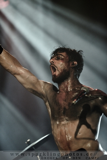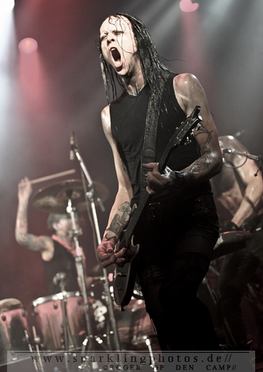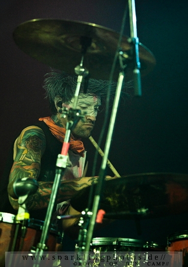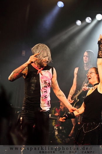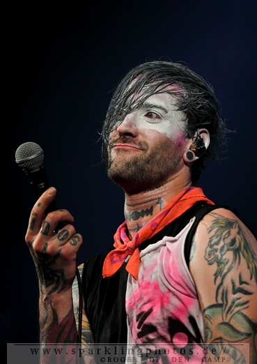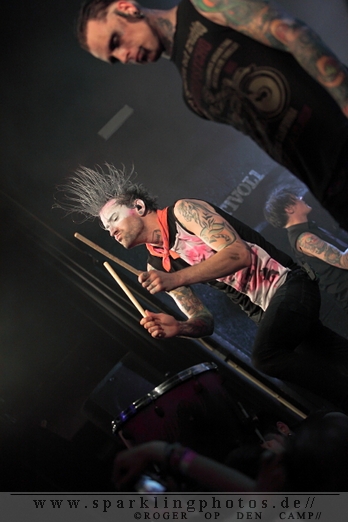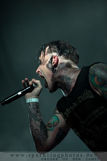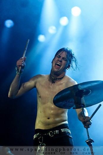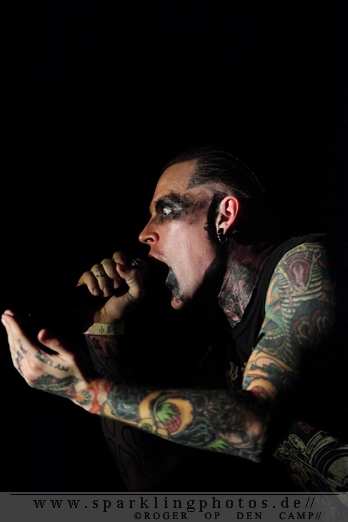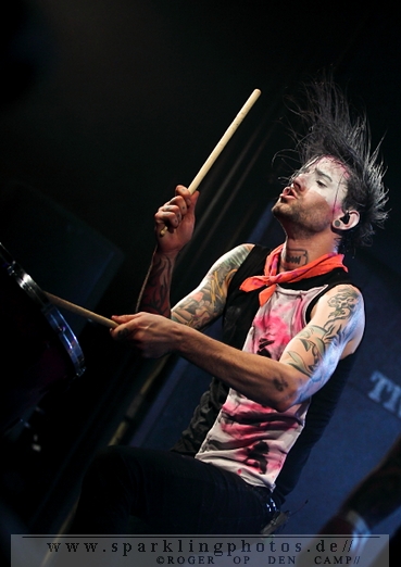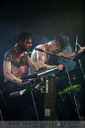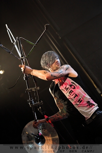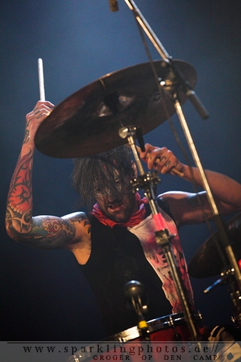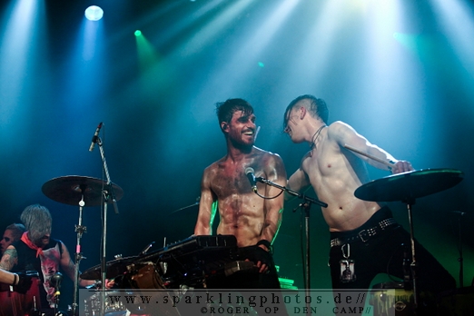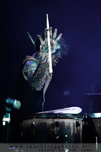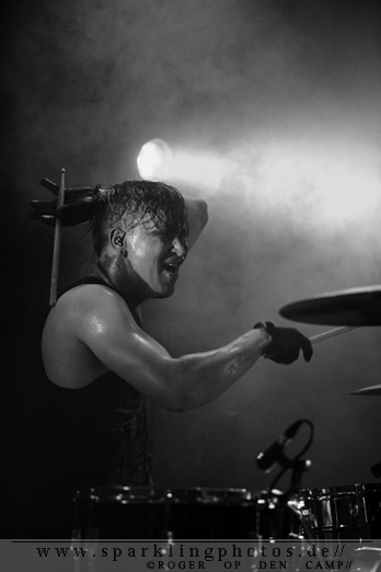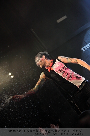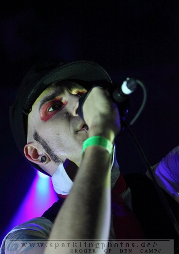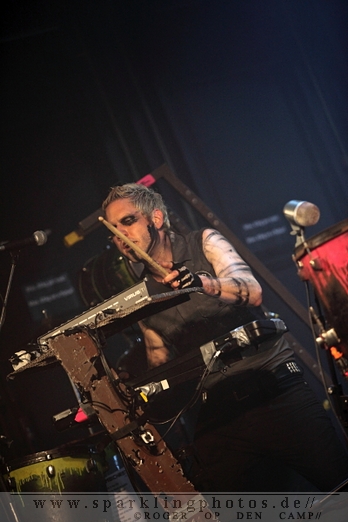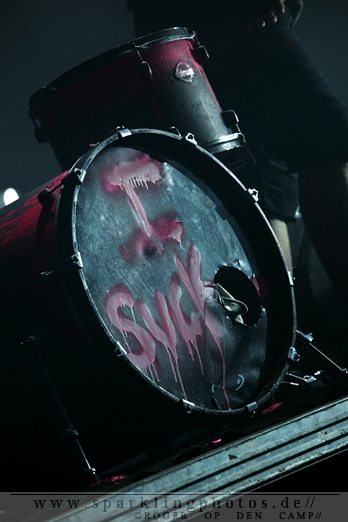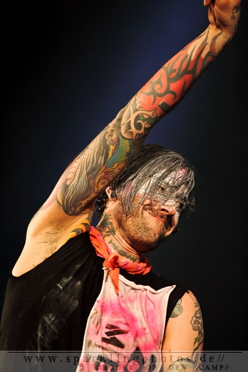 auf der Bühne von links nach rechts und wieder zurück. Es hatte fast den Anschein, dass die Heizungen hochgefahren wurden, um die Jungs noch mehr ins Schwitzen zu bringen und um ihre schwarz/weiß bemalten muskulären Körper zum Vorschein zu bringen. Sogar im Publikum blieb es nicht mehr lange trocken und innerhalb kürzester Zeit waren wir alle von oben bis unten vollgeschwitzt. Und dann konnten wir plötzlich unseren Augen gar nicht trauen, als Tim van Horn sich doch noch auf der Bühne zeigte und dort sein Ding machte. Joe schnappte sich ein Mädchen aus dem Publikum und nahm sie mit auf die Bühne. Das muss der schönste Moment ihres Lebens gewesen sein, der jedoch nicht lange andauerte, da sie ihre Aufgabe schnell im Crowd- Surfen fand. Jeder, der Combichrist bereits live erlebt hat weiß, was bei einer Show dieses Kalibers auf uns zukommen kann. Doch keine Show der energiegeladenen Jungs gleicht mittlerweile der anderen. Am Ende wurden auch hier nun wieder alle Instrumente auf der Bühne zerstört, was von dem finalen Song What the f*ck is wrong with you, der mit I did it my way folgte, passend begleitet wurde.Zufrieden, müde und nass machten wir uns also auf den Weg zurück ins Hotel, um zu duschen und zu schlafen. Denn der nächste Festivaltag stand bereits kurz bevor.
