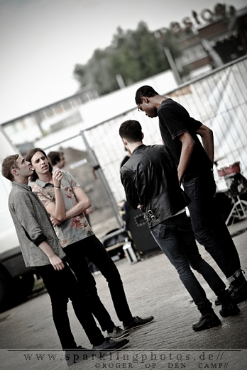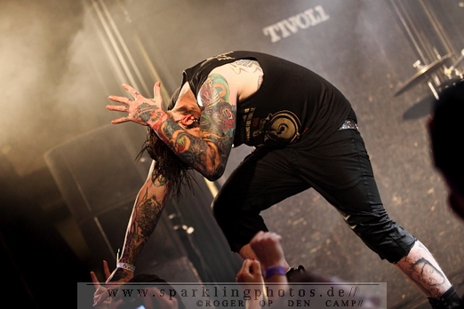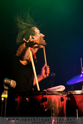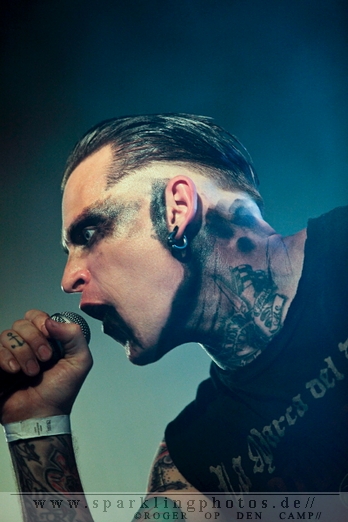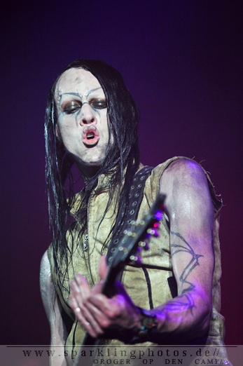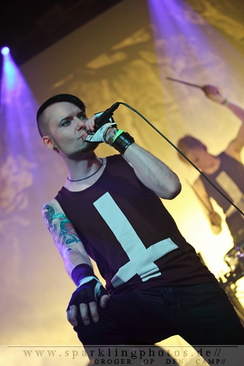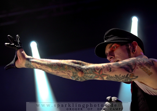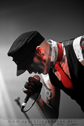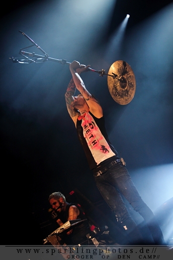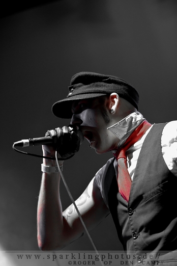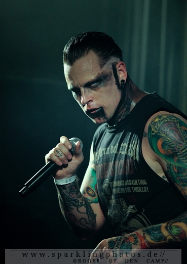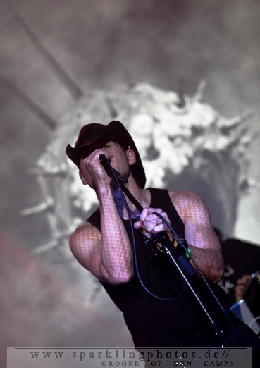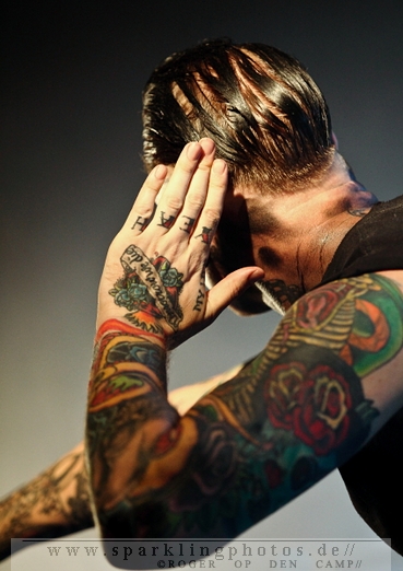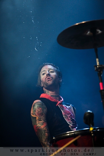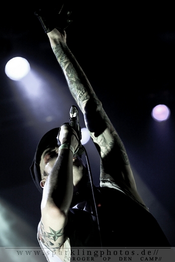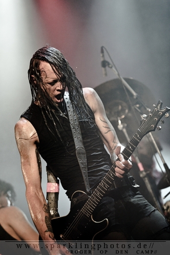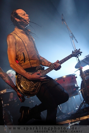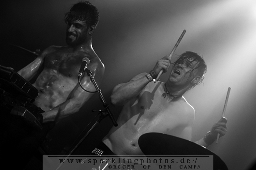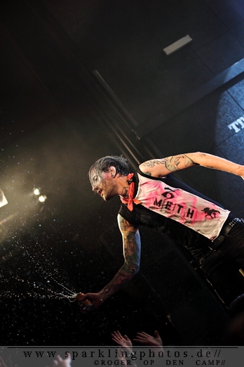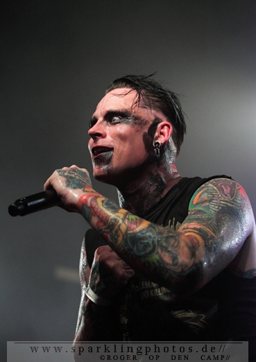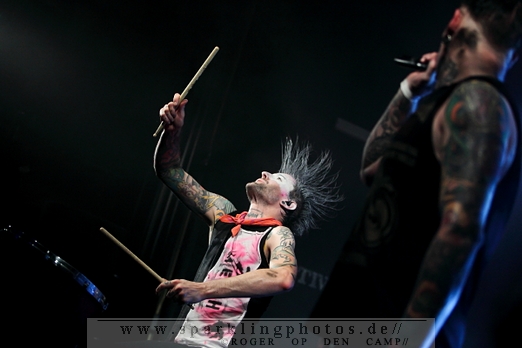 auf der Bühne von links nach rechts und wieder zurück. Es hatte fast den Anschein, dass die Heizungen hochgefahren wurden, um die Jungs noch mehr ins Schwitzen zu bringen und um ihre schwarz/weiß bemalten muskulären Körper zum Vorschein zu bringen. Sogar im Publikum blieb es nicht mehr lange trocken und innerhalb kürzester Zeit waren wir alle von oben bis unten vollgeschwitzt. Und dann konnten wir plötzlich unseren Augen gar nicht trauen, als Tim van Horn sich doch noch auf der Bühne zeigte und dort sein Ding machte. Joe schnappte sich ein Mädchen aus dem Publikum und nahm sie mit auf die Bühne. Das muss der schönste Moment ihres Lebens gewesen sein, der jedoch nicht lange andauerte, da sie ihre Aufgabe schnell im Crowd- Surfen fand. Jeder, der Combichrist bereits live erlebt hat weiß, was bei einer Show dieses Kalibers auf uns zukommen kann. Doch keine Show der energiegeladenen Jungs gleicht mittlerweile der anderen. Am Ende wurden auch hier nun wieder alle Instrumente auf der Bühne zerstört, was von dem finalen Song What the f*ck is wrong with you, der mit I did it my way folgte, passend begleitet wurde.Zufrieden, müde und nass machten wir uns also auf den Weg zurück ins Hotel, um zu duschen und zu schlafen. Denn der nächste Festivaltag stand bereits kurz bevor.