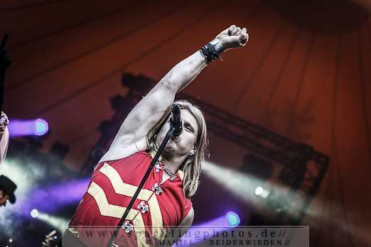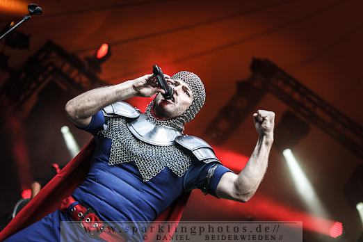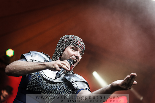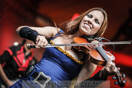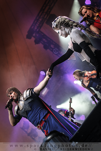 Samstagabend traten unter anderem Feuerschwanz auf, die eine sehr gute Bühnenperformance ablieferten. Der Sound stimmte und die Miezen machten Party. Das Publikum machte einfach alles, was die Herren sagten. Es war eine grandiose Stimmung an diesem Tag. Worauf wirklich alle während des Konzertes gewartet haben war die „Mama“, die ihre Schläuche in die Massen richtete um 25 Liter Met im Publikum zu verteilen.