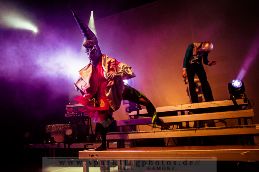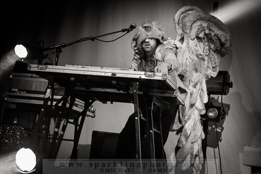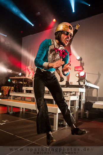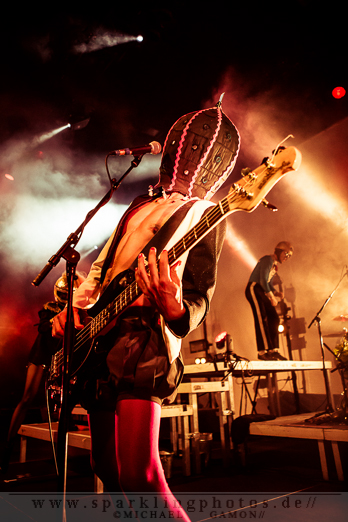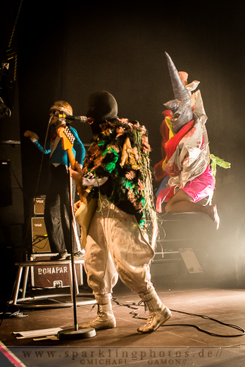 Beim bombastischen Intro ist es auf der Bühne noch übersichtlich. Die erste grazile Person tritt ins Erscheinungsbild, schreitet die Treppenempore herauf dreht sich um und lässt den meterlange Stoff ihres Kleides die Stufen hinunterwallen. Auf dem Kopf trägt sie ein großes Schiff. Unbeweglich und stumm steht sie im grell- dunklen Lichterbad einfach nur da und zieht alle Blicke auf sich. Das ist nur die Ruhe vor dem Sturm, ab jetzt geht es zu wie in einem Taubenschlag. Die Männer und Frauen um Mastermind Tobias Jundt fliegen ein und aus. Die Künstler des Kollektivs sind unzählbar. Das Bühnenbild wechselt im Sekundentakt. In der bizarren Show wird dem Auge alles geboten. Hässliche und hübsche Fantasiegestalten tanzen ausgelassen umher, Menschen in Tierkostümen, oder strippende Ringerinnen. BONAPARTE & TIM FITE - Dortmund, FZW (14.11.2012)Viel Haut und Erotik sorgen für einen sexy Gegensatz. Während des Zirkus halten die halbnackten Damen ein „We`re all Pussy Riot“ Plakat für einen Augenblick in die Höhe.