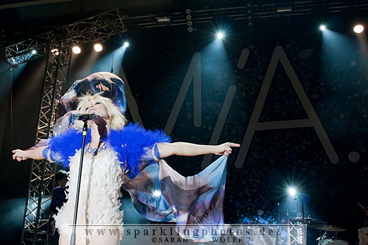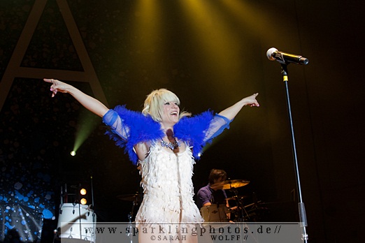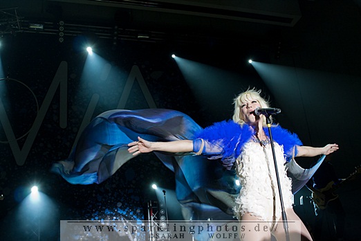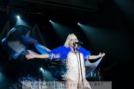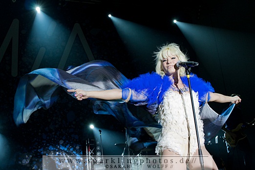 Pünktlich um 21 Uhr wird es im Saal dunkel und auf der Bühne hell. Mietze Katz steht in einem beigen, bestickten Body und einem blau-grünen Flatterumhang auf der Bühne, welcher von 3 Ventilatoren kräftig beim Flattern unterstützt wird. Und damit beginnt auch schon die fröhliche Modenschau á la Mietze Katz. Bei gefühlt jedem zweiten Song (realistisch wohl jedem dritten) schmeißt sie sich in eine neue Schale. Die Umzieh-Orgie kommt allerdings ihren begleitenden Musikern zugute. Diese haben nämlich in den so entstehenden Pausen die Möglichkeit ihre Fähigkeiten mit Soli unter Beweis zu stellen. Wirklich beeindruckend ist es dann als Mietze Katz bei dem Titel „La Boom“ sich mittels eines Reifens in die hohen Lüfte aufschwingt und dort eine Akrobatiknummer vom Feinsten abliefert. Jetzt wird klar: der Zuschauer hat am Abend wohl wesentlich mehr bekommen als erwartet. Obendrein wird auch immer wieder zu neuen Gimmicks gegriffen. Da werden Seifenblasen über die Bühne gepustet oder auch mal mit großem Hammer und noch größerer Geste ein Schaumstoffwecker mit Sollbruchstellen zerschlagen.