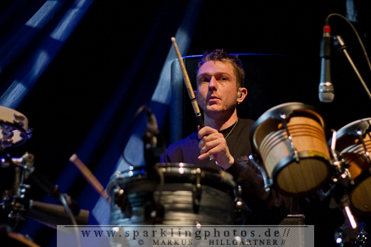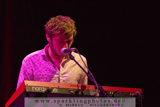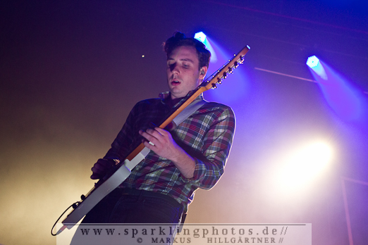 noch nach dem ungefähren Rhythmus des Liedes rumgesprungen wurde. Unterbrochen wurde dies erst vom Frontman selbst, als er zu The World is Watching ankündigte „We gonna play a slower song now“. Uff. Durchatmen und die Musik genießen bis es zur nächsten Eskalation kommt, dachte da wohl jeder und damit sollten sie auch Recht behalten. Spätestens zu Something Good Can Work, auch einer der „Klassiker“ auf ihrer Debütplatte, gab es dann wieder Grund und Rhythmus im Überfluss, um zu Springen. Vor dem vorletzten Song der offiziellen Setlist Handshake gab es dann noch ein in gebrochenem Deutsch „Dak-e-sön“ von dem sonst doch sehr wortkargen Alex Trimble. Danach kam es dann zu dem letzten der 15 offiziellen Songs Eat that up, it’s good for you, bei welchem dem Publikum große luftgefüllte Bälle zum Spielen zugeworfen wurden, was bestimmt nur gut gemeint war , aber ob dies nun wirklich förderlich für ein schönes Konzerterlebnis ist, soll dann lieber jeder für sich selbst entscheiden. Abschließend gab es die obligatorischen drei Zugabe-Lieder und ein weiterer Konzertabend im E-Werk ging zu ende.