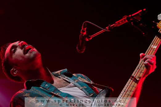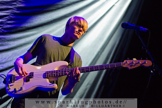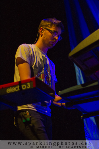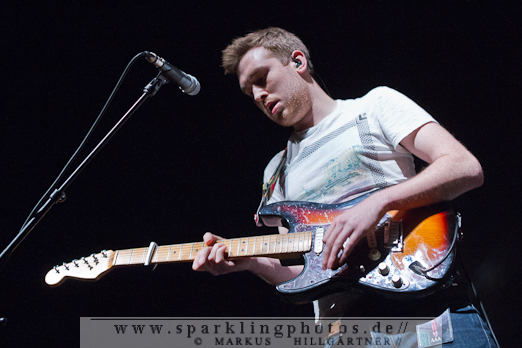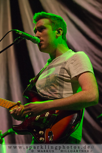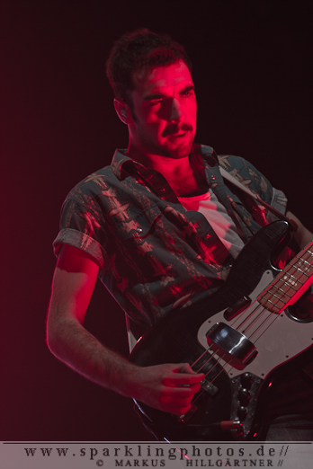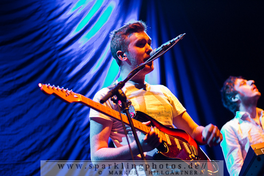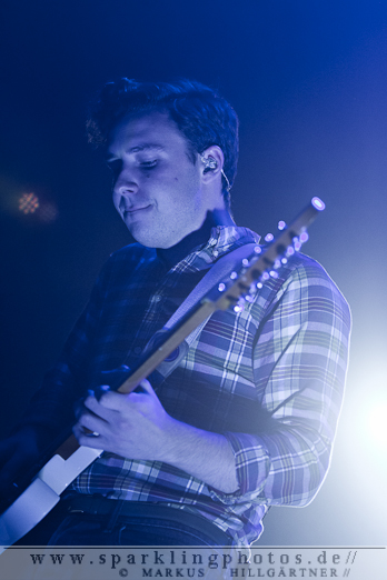 Das Licht wurde gedimmt, bis es schließlich erlosch, die Hintergrundmusik verstummte und die Fans kreischten und applaudierten, denn jeder wusste, dass es jetzt losgehen würde. Dann sah man sie, mit einer gewissen Zurückhaltung betraten Frontman Alex Trimbel, Gitarrist Sam Halliday und Bassist Kevin Baird die Bühne. Sie begannen mit dem Opener Sleep Alone, welches besonders zu Beginn sehr basslastig ist und die Menge nach der längeren Pause sofort wieder auf Betriebstemperatur brachte. Gefolgt von Undercover Martyn, eins der gefeiertesten Stücke von ihrem ersten Album. Dabei begeisterten die Lieder an sich, sowie der bloße Fakt, dass sie in einer sehr guten Soundqualität und Lautstärke präsentiert wurden, sodass die Band sich zunächst davon tragen ließ gut vorbereitet zu sein. Auch die Lichtshow trug dazu einen gewissen Teil bei. Die erwähnten LED-Läufe waren bestens auf den Rhythmus und die Emotionen in jedem Song angepasst und wurden optimal durch die Dynamik der motorisierten Strahlenscheinwerfer ergänzt. Diese Effekte waren besonders beeindruckend bei Sun, bei dem sich Trimble an das Keyboard setzte und die Lichttechnik durch viele einzeln gebündelte Strahlen eine Art künstliche Sonne über ihm erstrahlen ließ. Just Awesome! Weiter ging es mit Pyramid, bei dem sich im Zentrum der Halle die ersten ordentlichen Mosh Pits bildeten und die Fans langsam zur Höchstform aufliefen. Beim anschließenden I Can Talk war dann keiner mehr zu halten und die ganze Menge mischte sich ordentlich durch, sodass die Musik fast nebensächlich und nur