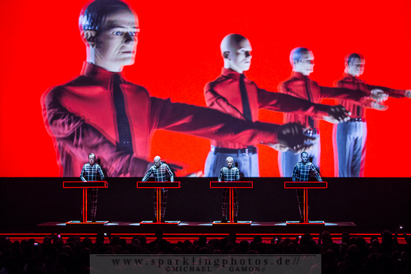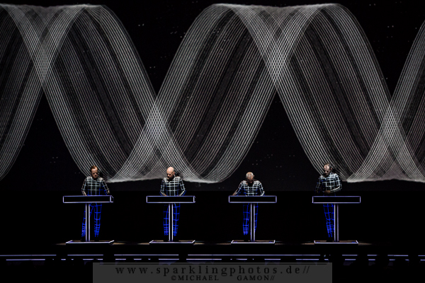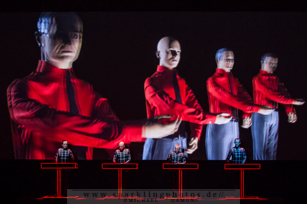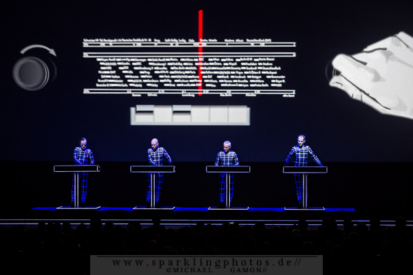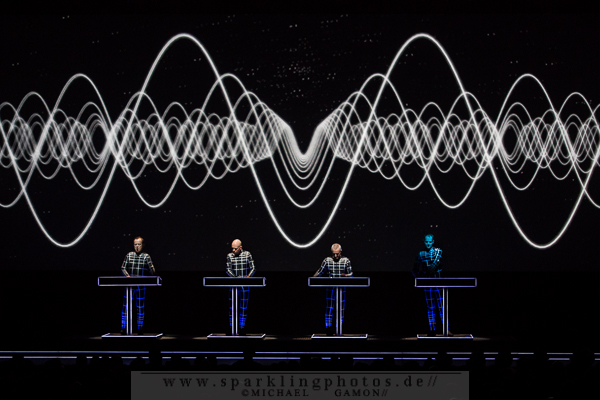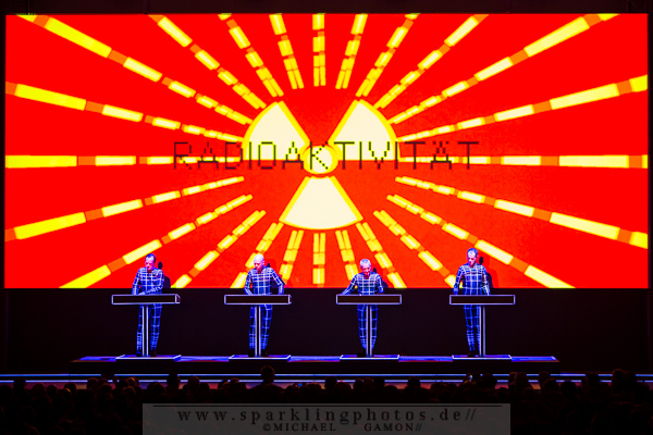 Pünktlich um 20 Uhr erklangen leise, elektronische Klänge, bevor das Saallicht gedimmt wurde und der Applaus der gut 800 Gäste an den Wänden der Grabbehalle widerhallte. Der alles verdeckende große Vorhang fiel herunter und machte den Blick frei auf die Audio Operatoren Ralf Hütter, Fritz Hilpert, Henning Schmitz und Video Operator Falk Grieffenhagen, die fast bewegungslos an ihren Pulten standen, bekleidet mit einer Art Neoprenanzug mit fluoreszierenden Streifen, die passend zu den Songs die Farben wechselten. Kurioserweise begann die Performance nicht mit Geigerzähler, dem ersten Song des 1974er Albums Radioaktivität, sondern mit dem wohl bekanntesten Stück Die Roboter, bei dem die Fans den ersten Eindruck der 3D Show bekamen, als die Arme der künstlichen Menschen auf der Leinwand tief ins Publikum ragten, was bereits für Begeisterungsstürme bei den Zuschauern sorgte. Nun sollte aber schon ein erster Höhepunkt beginnen: Radioaktivität, der in einer neuen, tanzbaren Version und mit aktualisierten Text (“Tschernobyl“, „Harrisburg“, „Selafield“, „Fukushima“) dargeboten wurde. Die Erwartungshaltung war groß, wie das weit über 30jährige Album im neuen Jahrtausend klingen sollte. Man stelle sich die Arbeit vor, die alten Bandaufnahmen zu digitalisieren oder den Text des Tracks Nachrichten herauszuhören. Spätestens bei Radioland war man dann voll im Thema Radio gefangen, die UKW Wellen schienen einen zu durchdringen. Kraftwerk als Sender, der Zuschauer als Empfänger. Bei Ätherwellen erschlugen eben diese als 3D Effekt von der Leinwand fast den Zuschauer, während bei Radiosterne schon eine fast hypnotische Wirkung erzeugt wurde. Die Animationen waren auf gewisse Weise altmodisch und fast als naiv zu bezeichnen. Schön anzusehen war es, dass einige mit 3D Brillen bewaffnete Fans auswichen, um nicht von der Antenne des Satelliten aufgespießt zu werden.