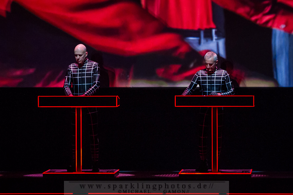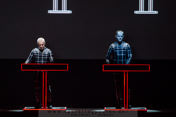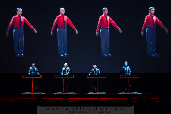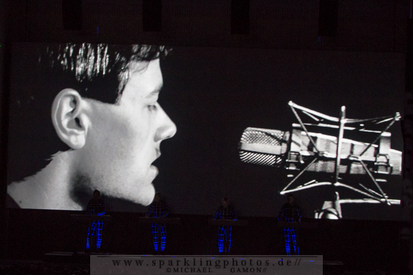 Jeder Song wurde frenetisch beklatscht und zauberte dem einen oder anderen „Musikarbeiter“ on Stage ein kleines Schmunzeln auf die Lippen. Damit die Performance nicht nur einen visuellen Kniff bekam, wurde die Musik im perfekten 5.1 Dolby Surround Ton präsentiert und so war man als Fan umso mehr im Rausch der Töne gefangen. Bei einem Kraftwerk Konzert stehen weniger die Personen im Vordergrund als dass sie Teil der Show, des Systems sind. Mensch und Technik als homogene Einheit. Nach gefühlten fünf Minuten war das komplette Album gespielt und es begann quasi ein „Best of“ des musikalischen Erbes der vier Menschmaschinen. Der Kulttitel Autobahn wurde in einer 14minütigen Version gespielt, bei der keine Langeweile aufkam, da er wie im Original recht abwechslungsreich arrangiert wurde. Bei Trans Europa Express und Metall auf Metall konnte man die Geburt der Industrialmusic noch einmal miterleben, denn letztgenannter Song war noch weit vor Einstürzende Neubauten und Konsorten in den Gehörgängen zuhause. Besonders hier kam der 5.1 Sound besonders gut herüber. Da schepperte Metall von links, von rechts und von hinten. Die meiste Arbeit hatte das einzig übriggebliebene Gründungsmitglied Ralf Hütter, der die meisten Melodien spielte, den Vocoder bediente und sang. Natürlich durfte auch Das Model nicht fehlen, wohl einer der ersten Synthiepop Songs der Welt, dessen Clip mithilfe von 2D Archivaufnahmen präsentiert wurde. Nachhilfeunterricht in Mathematik gab es mit Numbers, bevor Computerwelt ertönte und das fast schon prophetische Heimcomputer (stellt man den Track in den zeitlichen Kontext zum Entstehungsjahr des Songs), welcher die Synapsen zum Glühen brachte. In zeitlicher Abfolge wurden ausgewählte Songs aller acht Alben gespielt, seien es Die Mensch-Maschine vom gleichnamigen Album von 1978, Tour de France (wiederum durch 2D Archivaufnahmen und 3-D Effekten visuell garniert), Vitamin vom Tour de France Soundtrack Album aus 2009 (schön hier die sich im Wasserglas auflösenden Tabletten, deren Bläschen in die Gesichter der Zuschauer prickelten) und Tracks von Electric Café (später unbetitelt zu Techno Pop), sowie das selten gespielte Planet der Visionen in einer fast technolastig zu nennenden Version. Detroit, Germany, we’re so electro!