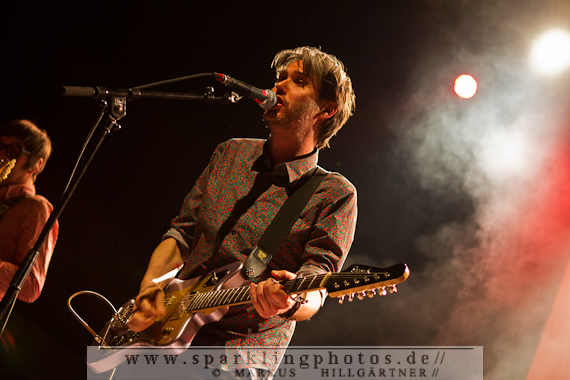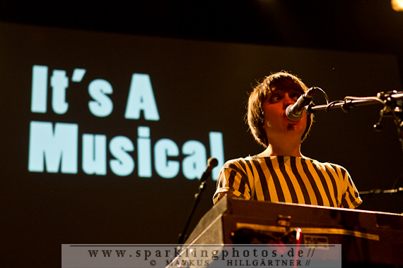 Bei der Vorband handelte es sich um die eher weniger bekannte Indietronic Band It’s A Musical aus Berlin. Das Duo aus Berlin besteht aus der Schwedin Ella Blixt, welche bei dem Musikprojekt It’s A Musical den Gesang und die Orgel zusteuert, sowie dem deutschen Robert Kretzschmar, der auch singt und das Schlagzeug und Xylophon bedient. Auf der Bühne hatten es die beiden nicht allzu leicht, da sich ihre Musik deutlich von der von Tocotronic abgrenzt und somit ein großer Teil des Publikums nicht so viel damit anfangen konnte. Aber sie spielten unbeirrt ihre Musik und hatten allem Anschein nach viel Freude dabei. Immer wieder sahen sie sich zwischen den Liedern an und fingen dabei an zu grinsen, dass machte natürlich auch Freude beim hinsehen! Auch ihre Bühnenshow war schön anzusehen, während Ella Blixt viel über die Mimik und Gestik an Emotionen transportierte, versuchte es Robert Kretzschmar eher traditionell, indem er Kunststücke mit seinen Sticks präsentierte. Nach sechs Liedern verließen sie schon wieder die Bühne und die Umbauten für Tocotronic konnten beginnen.
