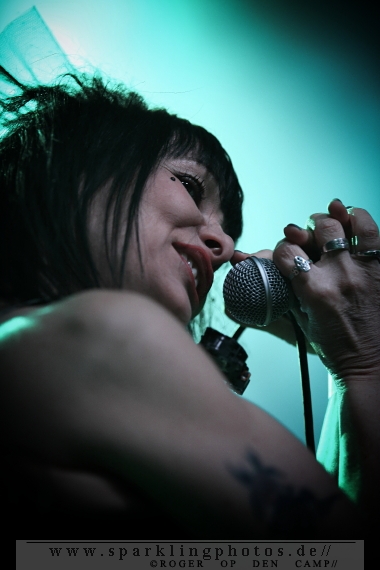 Die erste Band für uns bei diesem Festival heißt Simi Nah. In den belgischen Medien hat sie den Titel „French Electro Gothic Queen“ verliehen bekommen. Ihre Show ist extravagant und großartig, auch wenn dabei nicht immer verständlich ist, ob dies eher mit den Outfits oder dem Tanzen zu tun hat. Jedenfalls war es ein sehr tanzbarer Anpfiff!