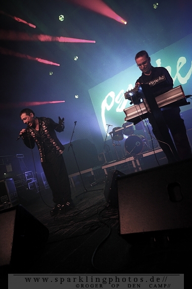 Psyche, ein Urgestein des Synthiepops betritt danach die Bühne. Mittlerweile kann Psyche auf drei Jahrzehnte zurückblicken und deshalb wird es das Jubiläumskonzert zum 30- jährigen Bestehen. Im Herbst soll ein neuer Longplayer erscheinen, der allerdings nicht nur mit frischem Material bestückt ist, sondern auch mit Re-recordings von Sanctuary, Tears und Goodbye Horses. Selbstverständlich wird Goodbye Horses auch bei diesem Konzert live vorgetragen, eine fantastische Interpretation des Q Lazzarus Originals. Die Stimme von Darrin Huss ist in optimaler Verfassung – perfekt und sauber. Zwischendurch blitzen plötzlich die Worte „The Invincible Spirit“ über die Monitore, doch so weit sind wir noch nicht und es geht natürlich weiter mit Psyche. Für uns ist es eine schöne Überraschung, dass sie Maggots spielen. In den frühen Achtzigern war dies sicherlich ein Psyche Stück, das die Tanzflächen füllte. Wir haben Psyche schon oft live gesehen, doch diesmal hören wir diesen Song zum erstem Mal bei einem Konzert. Mit Brain Collapse folgt ein weiterer Klassiker jener Zeit. Die Leute möchten noch mehr hören und verlangen eine Nachschlag, was bei einem straff geplanten Festival allerdings nicht möglich ist.
