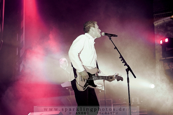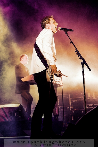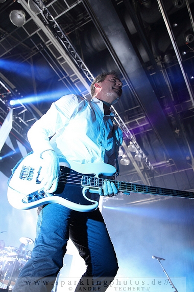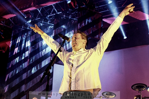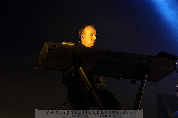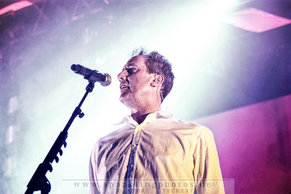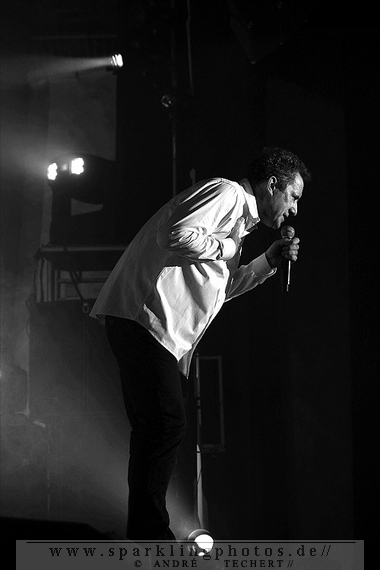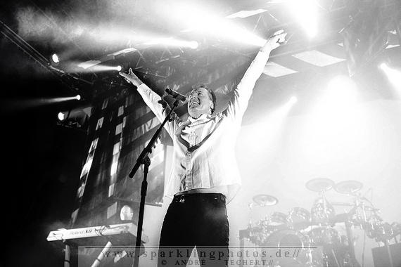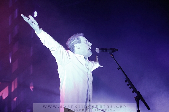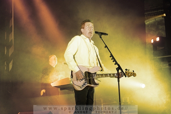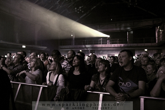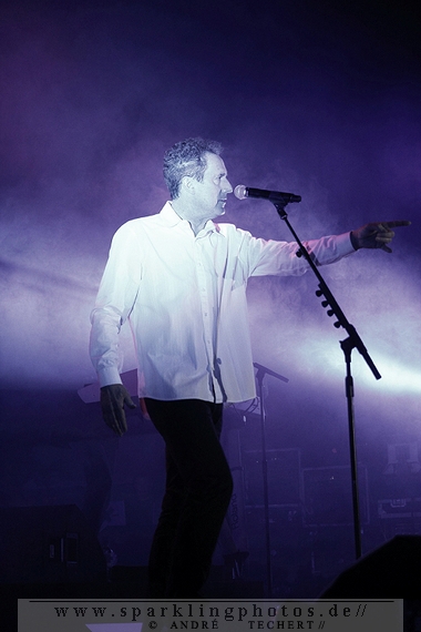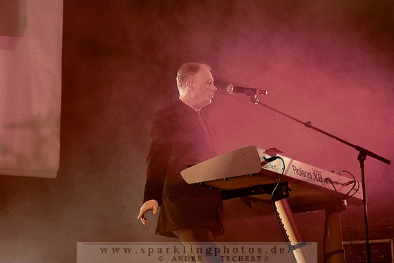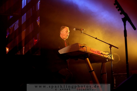 Die neue Single Dresden bestand die Live-Feuerprobe spielend, denn das Lied klingt wie aus der Mittachtziger Phase von OMD und ist ein reiner Ohrwurm. Das änderte auch nichts an den ungelenken Moves des Sängers, der wie ein Derwisch über die Szene „tanzte“. McCluskey: „Nun zu Andys Tanzschule!“. Leider hatten die Zuschauer reichlich wenig Platz, es dem Sänger nachzumachen und mit den Armen zu rotieren. Endlich hatte auch Mr. Humphries die Gelegenheit, sein Können unter Beweis zu stellen. Sein Solo (Forever) live and die brachte ihm einen Riesenapplaus ein und war aufgrund der Reaktion der Massen mehr als überwältigt. Während bei If you leave die Projektoren auf den Banner Szenen des 80er Films Pretty in Pink zu sehen waren, zeigte Keyboarder Martin Cooper am Saxophon sein Können. Der herrlich wavige Track Souvenir ist einfach eines der schönsten Stücke melancholisch-elektronischen Songwritings und der „All time Classic“ wurde stimmungsvoll durch eine tolle Lightshow (Die Scanner warfen interessante Muster an die Wände des E-Werks) unterstützt, während Andy mit seinem Bass auf dem Drumriser von Schlagzeuger Malcolm Holmes rockte. Nun kam der „weibliche“ Teil der Show, denn die Hits Joan of Arc, bei dem rhythmisches Klatschen laut wurde und Maid of Orleans (Distortion im Walzertakt) dürfen auf keinem Konzert der Briten fehlen. Damit man als Zuschauer nicht irgendwann vor lauter Tanzwut kollabierte, gab es auch Momente des Aufatmens, wie z.B. beim Titel Our System, der durch die blaue Lichtshow eine Atmosphäre wie in einem Raumschiff kreierte. Kissing the Machine, der Song, der unter dem Projektnamen Elektric Music bereits in den 90er Jahren erschien, wurde durch Andy mit den Worten „Ist meine Frau kalt wie ein Roboter?“ eingeleitet und der Musiker vergaß vor lauter Shakern mit dem Publikum den Einsatz der ersten Strophe. „Seid ihr müde?“ rief ein gut gelaunter Andy in die Runde und intonierte Pandoras Box, einen Song, aus der „Solophase“ von OMD, aber die Fans waren alles andere als erschöpft. Die Stimmung erreichte seinen Siedepunkt und man merkte immer wieder, wie die Wellen der Sympathie zwischen Band und deren Anhängern hin- und her schwappten und bei Sister Mary says konnte man so einige „Hüpfdolen“ im Zuschauerraum beobachten, denn das gut gelaunte Kölner Publikum tanzte sich wahrlich in Trance. Dass Zeit relativ ist, wenn man Freude empfindet, musste man an diesem schönen Konzertabend leider wieder erfahren, aber Enola Gay sorgte in der Endphase des Konzertres gottlob wieder für kochende, schweißtreibende Freude und da es der letzte Song des Hauptsets war, riefen die Massen im Takt der Drummachine (als die Band längst die Stage verlassen hatte) ihre Zugabe-Rufe, bis die glorreichen vier zurückkehrten und sich schlußendlich für ihre Encores Secret und Electricity feiern liessen, bevor sie die Fans in die schöne Mainacht entließen.