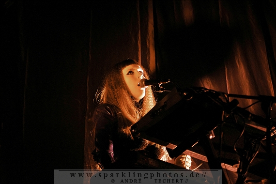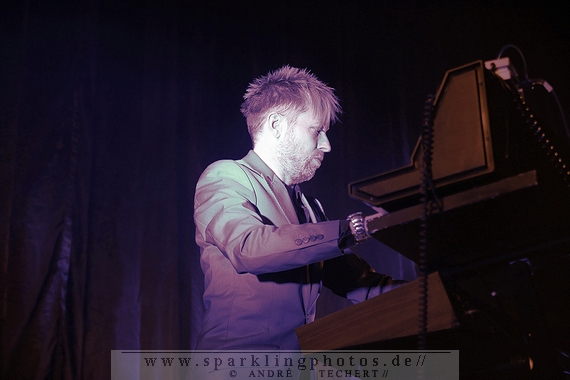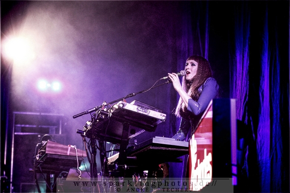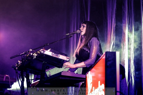 Aber dann durfte es losgehen. Das Duo, welches auch privat ein Paar ist, brachte lupenreinen Wavepop auf die Bühne und ihr minimaler Sound konnte durchaus überzeugen. Swan sah aus wie der junge Vince Clarke (Depeche Mode, Yazoo, Erasure) und das ergibt durchaus seinen Sinn, denn der Sound von Vile Electrodes ist dem von Yazoo näher als dem von aktuellen Synthiepop Bands heutiger Zeit. Die sympathische Leading Lady Neon wusste nicht nur stimmlich zu überzeugen, sondern auch durch ihre deutschen Sprachkenntnisse („Mein Kaninchen ist tot“!). Das Paar hatte die Kölner Zuschauer gut im Griff, denn obwohl ihre Musik nicht gerade durch tolle Melodien auffiel, kreierten sie jedoch eine heimelige Atmosphäre. Das besonders wavige Deep Red kam live besonders gut zur Geltung. Sängerin Neon bedankte sich abschließend bei ihrer Crew und natürlich bei OMD, die bereits in den Startlöchern steckten. Setlist Vile Electrodes: