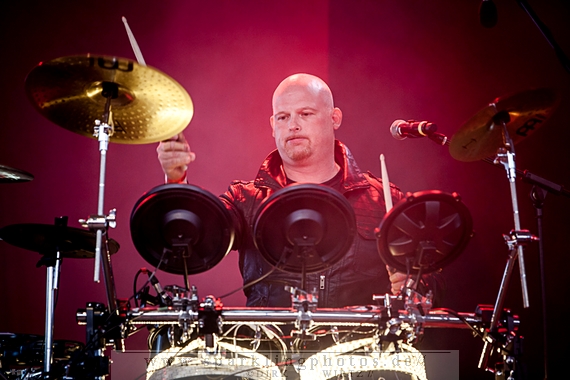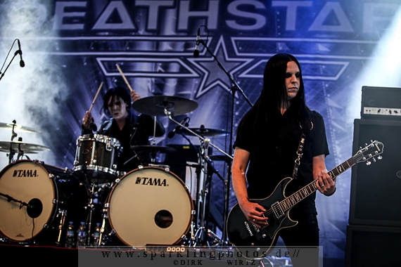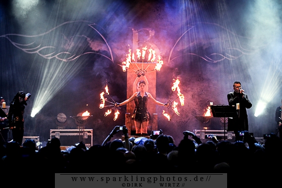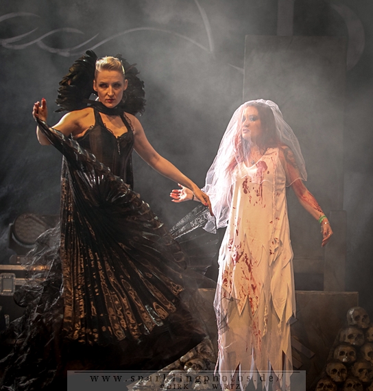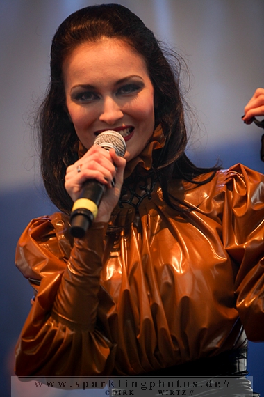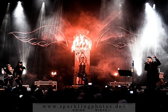 Und zumindest auf den Bereich vor der Bühne springt der berühmte Funke über, während sich die Besucher auf den Rängen mit dem wiedermal einsetzenden Regen herumplagen. Mit diesem haben auch die schwedischen Industrial/Gothic Metaller Deathstars [GALLERY] zu kämpfen – sieht man doch während ihrer Show weit mehr schwarze Regenschirme als tanzende Menschen. Vielleicht liegt es aber auch daran das die harten Klänge nicht ganz zum restlichen Line-Up des Tages passen. Deutlich mehr los ist dann beim Headliner des Tages Blutengel [GALLERY]. Man mag von dieser Band halten was man will, deren Live-Auftritte bieten doch Einiges für Auge und Ohr. Neben gläsernen Drums, Feueracts und spärlich bekleideter Tänzerinnen präsentieren Chris Pohl und Sängerin Ulrike Goldmann viele Stücke vom neuen Album Monument, aber auch mit altbekannten Songs laden Blutengel die Blackfield Besucher zum Tanzen ein.