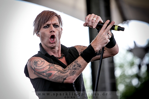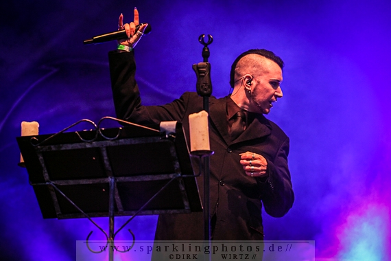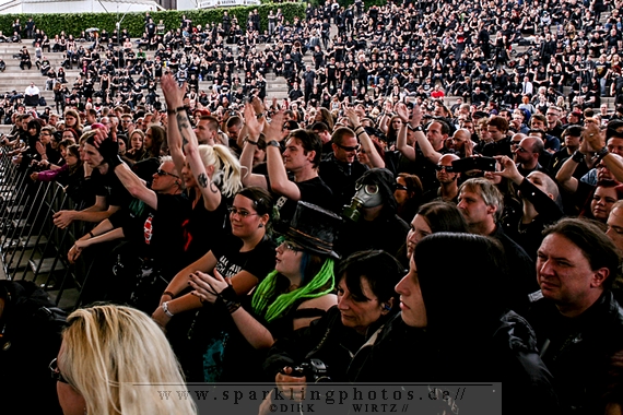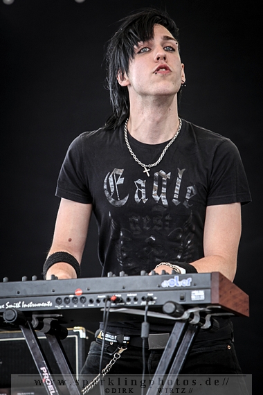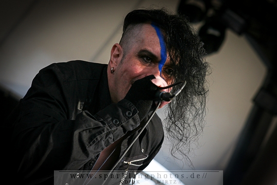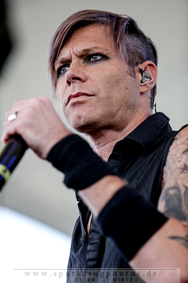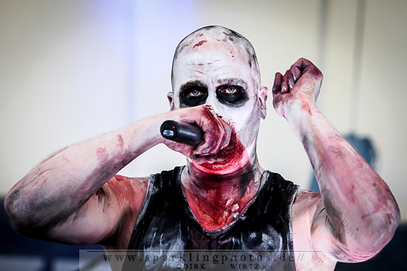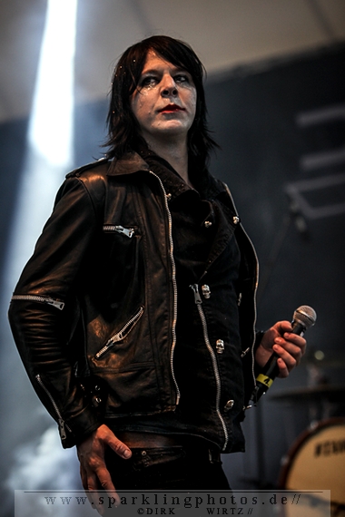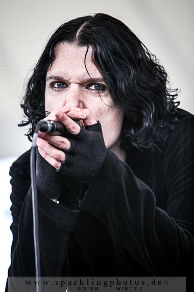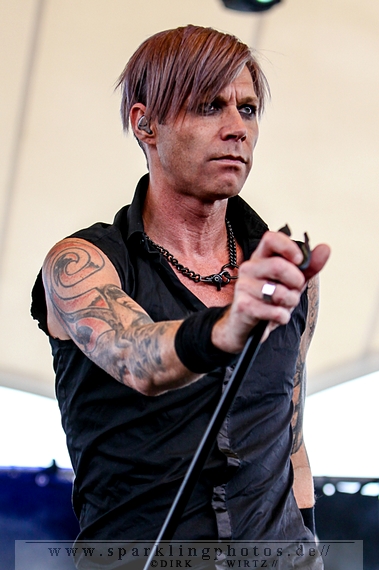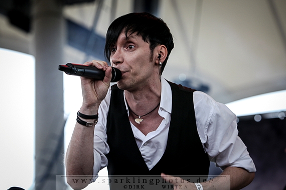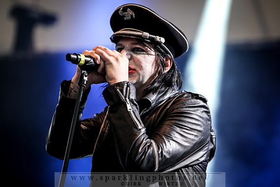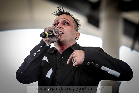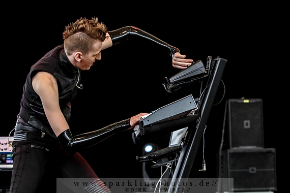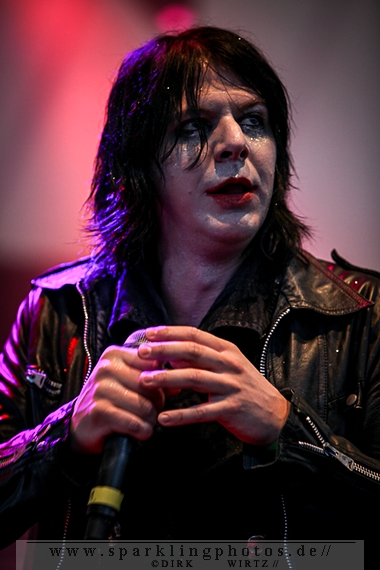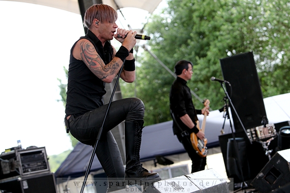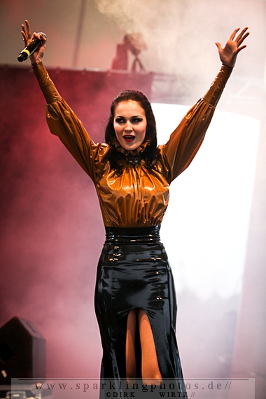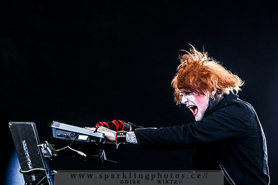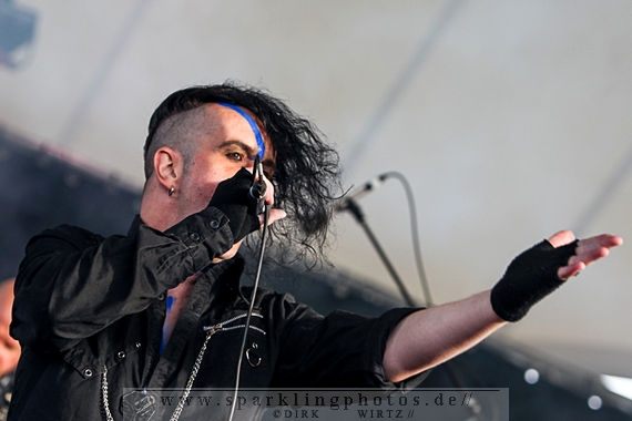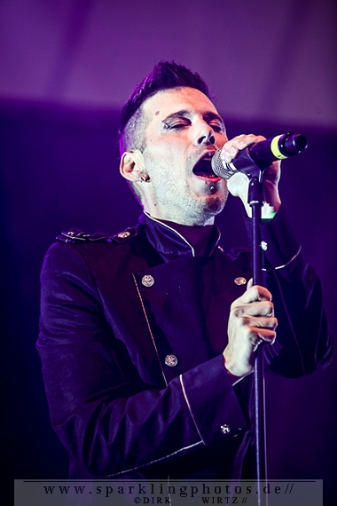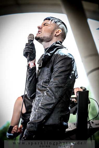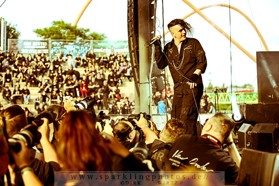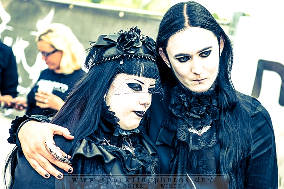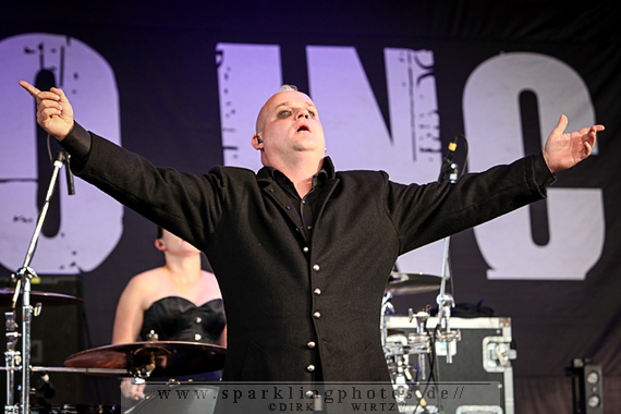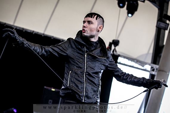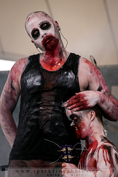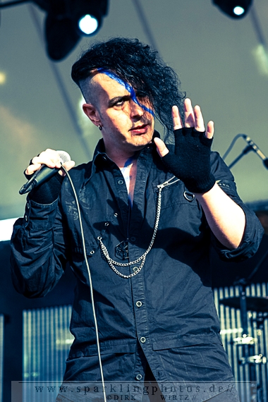 Der Samstag startet regnerisch. Davon lassen sich die Berliner Formalin [GALLERY] jedoch nicht abschrecken und versuchen den wenigen Frühaufsteher mit krachenden Industrialbeats einzuheizen, was aber nur mäßig gelingt. NOYCE™ [GALLERY] ergeht es nicht besser, auch ihr feiner Electro Pop bringt nur vereinzelte Besucher in Tanzlaune. Ganz anders bei der nächsten Band Aesthetic Perfection [GALLERY]. Die Aggrotech Formation aus Hollywood kann durchaus als Überraschung des Festivals angesehen werden. Und macht trotz der frühen Uhrzeit ordentlich Stimmung. Ganz ausgeschlafen ist Frontmann Daniel Graves anscheinend allerdings nicht, denn er begrüßt das Publikum in Gelsenkirchen mit einem „Hallo Leipzig“, bemerkt seinen Fauxpas jedoch sofort und entschuldigt sich vielmals. Auch wenn sich zu Lord Of The Lost [GALLERY] etwas weniger Zuschauer vor der Bühne einfinden, stimmungsmäßig stehen die Hamburger der vorherigen Band kein Stück zurück. Vor allem bei den weiblichen Fans finden die fünf Jungs großen Anklang, was sicher auch daran liegt, dass sich alle Bandmitglieder während des Auftritts mit freiem Oberkörper präsentieren. Mit den Merciful Nuns [GALLERY] haben die Veranstalter leider angesichts des musikalischen Umfelds einen ziemlichen Fehlgriff getan. Nach so viel Stimmung kommt der düstere Achtziger Jahre Gothic Rock überhaupt nicht an und so leert sich der Platz vor der Bühne zunehmend und auch auf den Rängen verschwinden während des Auftritts immer mehr Leute. Wirklich schade für die Band, welche sich nach gut einer halben Stunde geschlagen gibt und von der Stage verschwindet. Zu [:SITD:] [GALLERY] füllt sich das Amphitheater