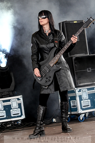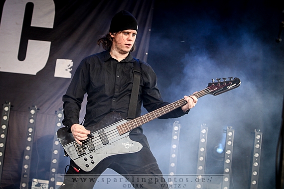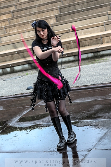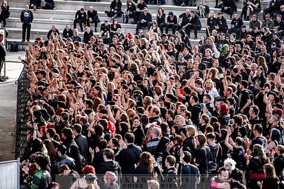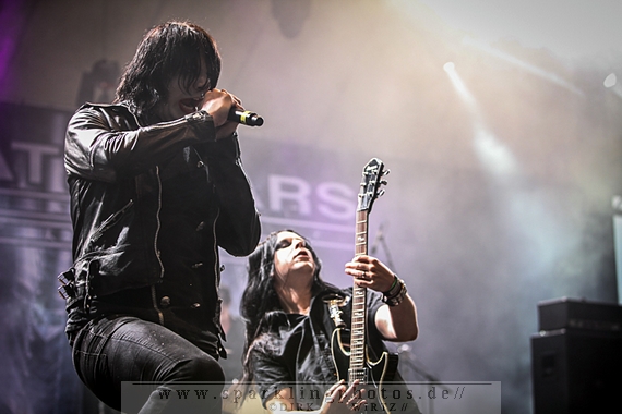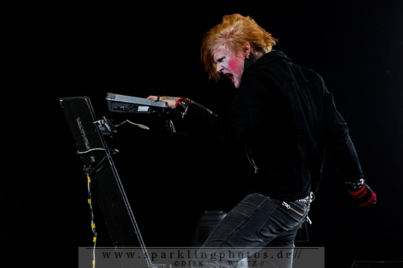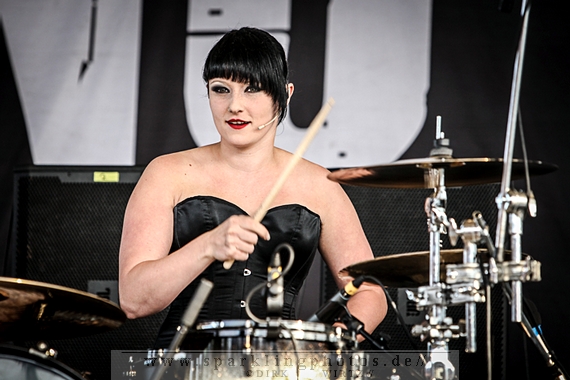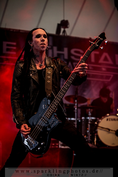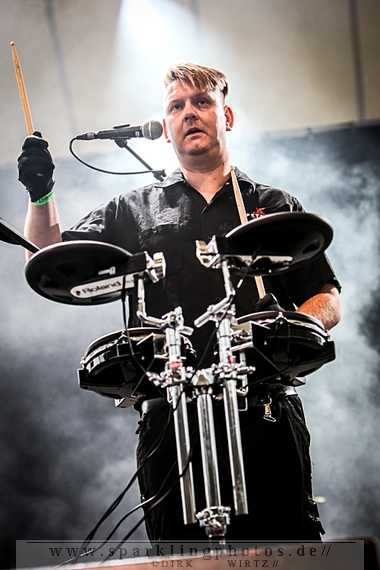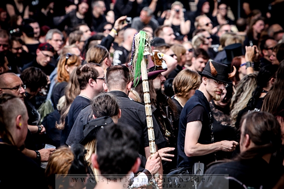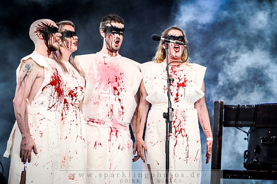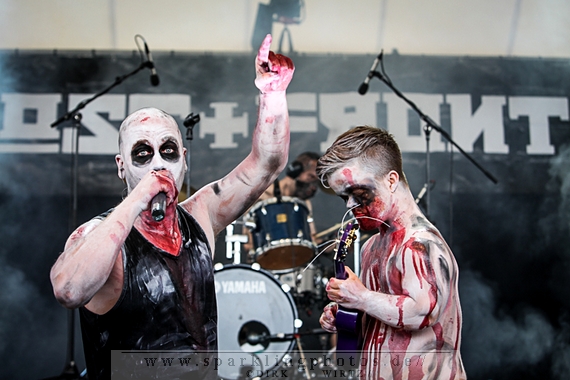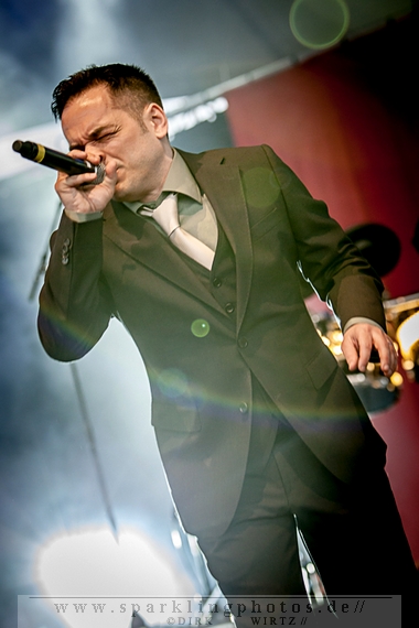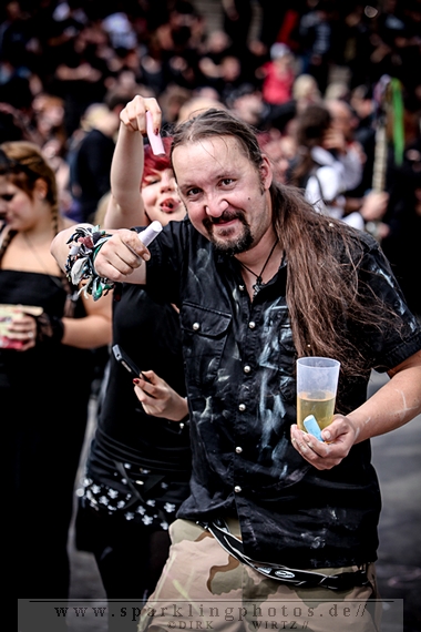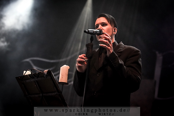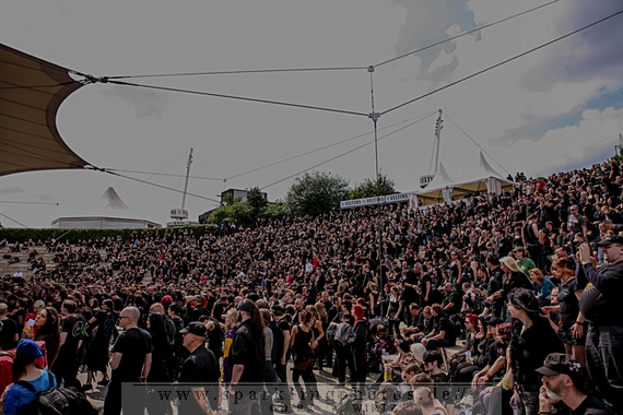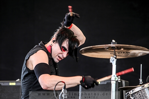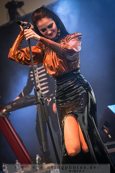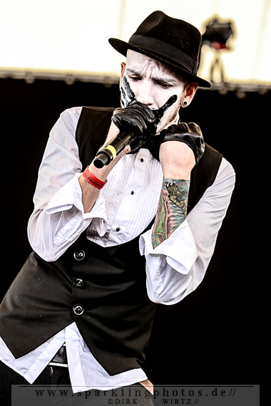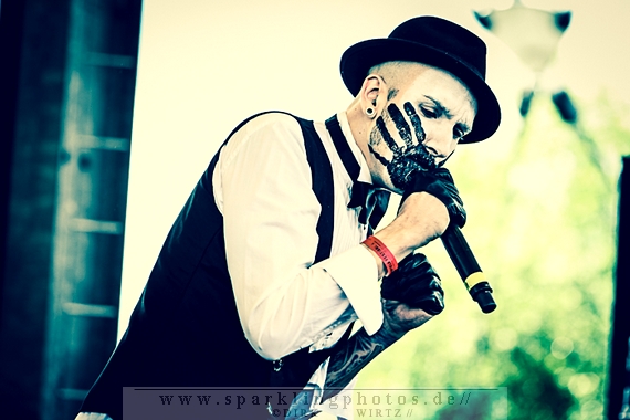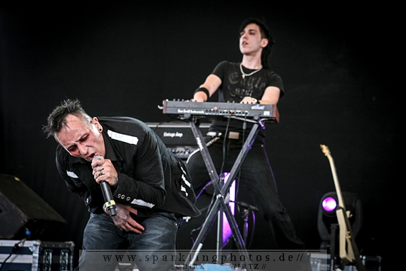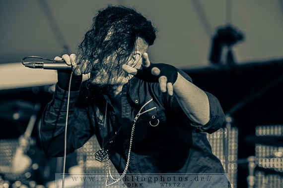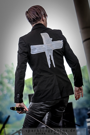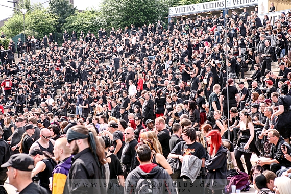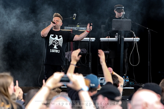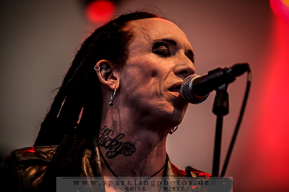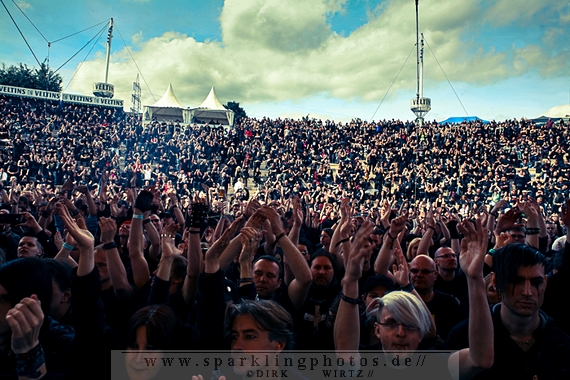 Der Samstag startet regnerisch. Davon lassen sich die Berliner Formalin [GALLERY] jedoch nicht abschrecken und versuchen den wenigen Frühaufsteher mit krachenden Industrialbeats einzuheizen, was aber nur mäßig gelingt. NOYCE™ [GALLERY] ergeht es nicht besser, auch ihr feiner Electro Pop bringt nur vereinzelte Besucher in Tanzlaune. Ganz anders bei der nächsten Band Aesthetic Perfection [GALLERY]. Die Aggrotech Formation aus Hollywood kann durchaus als Überraschung des Festivals angesehen werden. Und macht trotz der frühen Uhrzeit ordentlich Stimmung. Ganz ausgeschlafen ist Frontmann Daniel Graves anscheinend allerdings nicht, denn er begrüßt das Publikum in Gelsenkirchen mit einem „Hallo Leipzig“, bemerkt seinen Fauxpas jedoch sofort und entschuldigt sich vielmals. Auch wenn sich zu Lord Of The Lost [GALLERY] etwas weniger Zuschauer vor der Bühne einfinden, stimmungsmäßig stehen die Hamburger der vorherigen Band kein Stück zurück. Vor allem bei den weiblichen Fans finden die fünf Jungs großen Anklang, was sicher auch daran liegt, dass sich alle Bandmitglieder während des Auftritts mit freiem Oberkörper präsentieren. Mit den Merciful Nuns [GALLERY] haben die Veranstalter leider angesichts des musikalischen Umfelds einen ziemlichen Fehlgriff getan. Nach so viel Stimmung kommt der düstere Achtziger Jahre Gothic Rock überhaupt nicht an und so leert sich der Platz vor der Bühne zunehmend und auch auf den Rängen verschwinden während des Auftritts immer mehr Leute. Wirklich schade für die Band, welche sich nach gut einer halben Stunde geschlagen gibt und von der Stage verschwindet. Zu [:SITD:] [GALLERY] füllt sich das Amphitheater