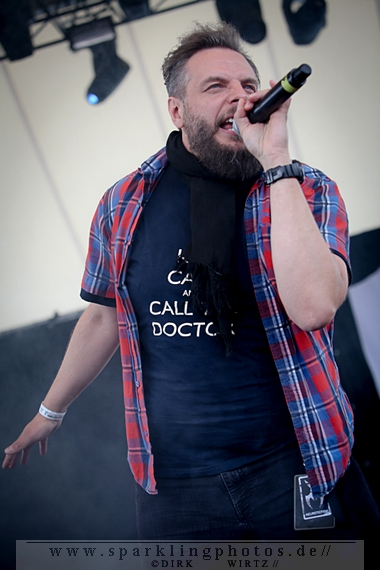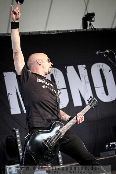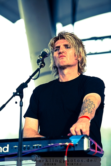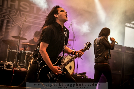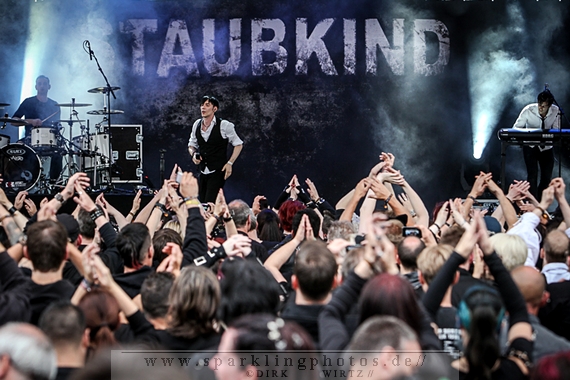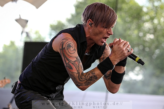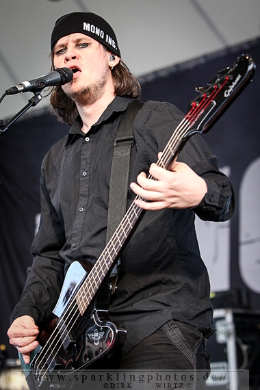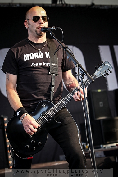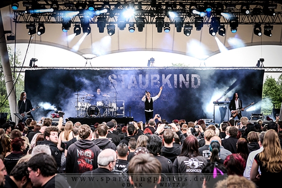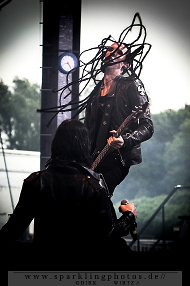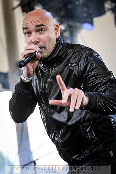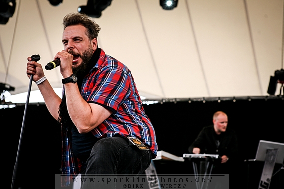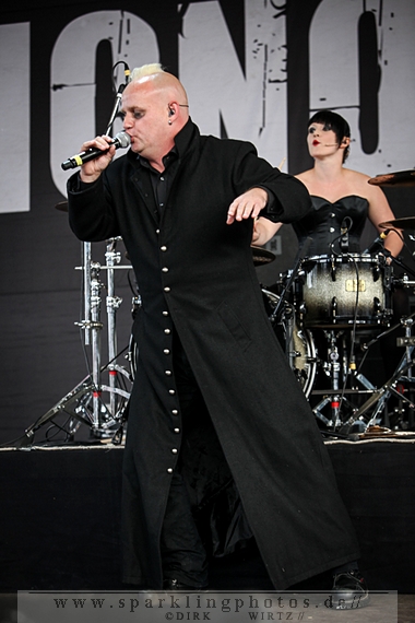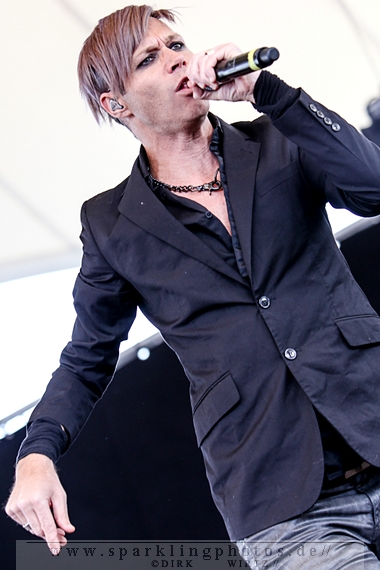 Richtig voll wird es dann wieder bei Rotersand [GALLERY]. Die mittlerweile nur noch zwei Akteure in Person von Sänger Frontmann Rascal Nikov und Krischan J. E. Wesenberg an den Reglern locken viele Besucher zum Tanzen nach vorne. Mit Merging Oceans, Exterminate Annihilate Destroy, Waiting to be born und War On Error hat die Band aber auch einige gut tanzbare Clubhits im Repertoire. Nach so viel elektronischer Musik in Folge kommen mit Staubkind [GALLERY] nun deutliche rockigere Töne aus den Boxen. Die Band um Sänger Louis Manke tut sich allerdings etwas schwer den Funken auf die Menge überspringen zu lassen. Zwar haben die Deutschrocker den Platz vor der Bühne im Griff, auf den Rängen zeigt sich jedoch eher Gleichgültigkeit als Begeisterung. Dennoch tut diese Abwechslung dem Festival gut und bereitet die Besucher bestens auf die beiden Headliner des Abends vor, bei denen auch die Gitarren im Vordergrund stehen. Mit Mono Inc. [GALLERY] haben die Veranstalter die Band der Stunde als Co-Headliner verpflichtet und zudem eine Truppe die durch eine beeindruckende Live-Präsenz überzeugt. Die Hamburger starten mit My worst enemy, gefolgt von Symphony of pain und der aktuellen Single Heile heile Segen, dem ersten deutschen Song der Gruppe. Etwas gewöhnungsbedürftig ist dieses neue Stück schon. Mit im Gepäck haben Mono Inc. noch einen Überraschungsgast und zwar niemand Geringeres als Joachim Witt, mit dem sie zusammen die Weltpremiere des Stücks Kein Weg zu weit zelebrieren. Dieses Highlight wird zusätzlich von einem Mädchenchor gesanglich begleitet. Weiter geht es dann mit zahlreichen Hits der Band wie Arabia, After the war und Revenge bis mit Get some sleep unweigerlich der letzte Song gespielt wird.