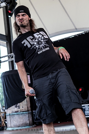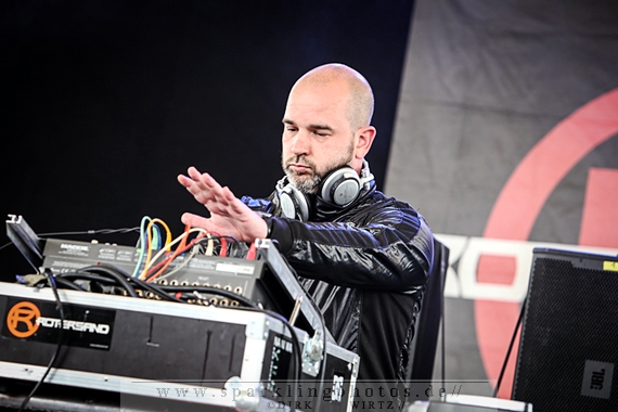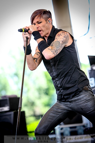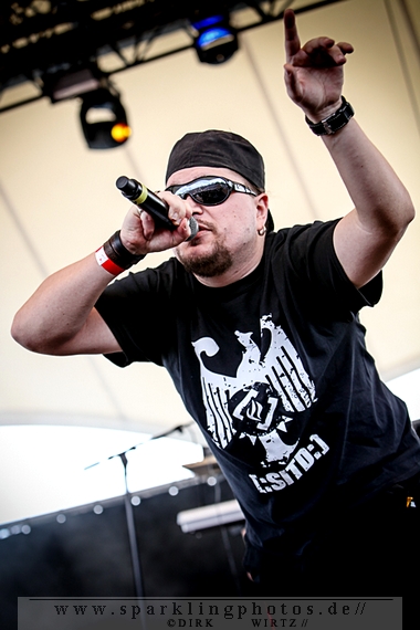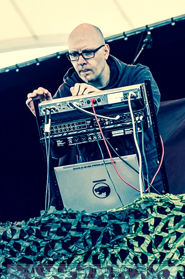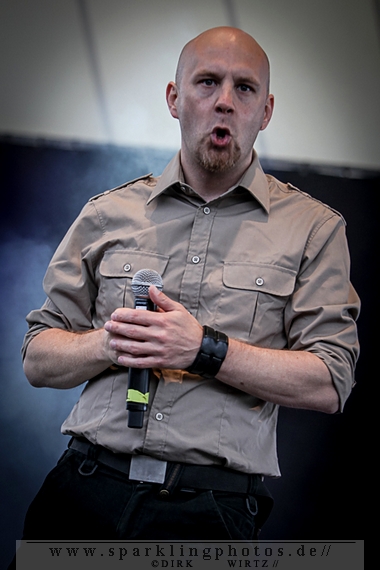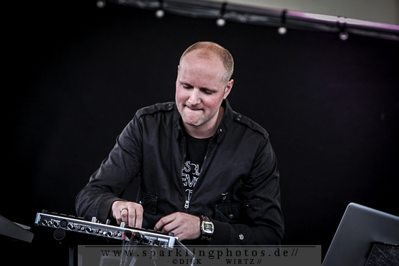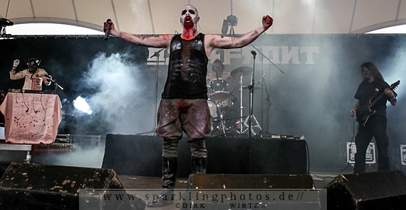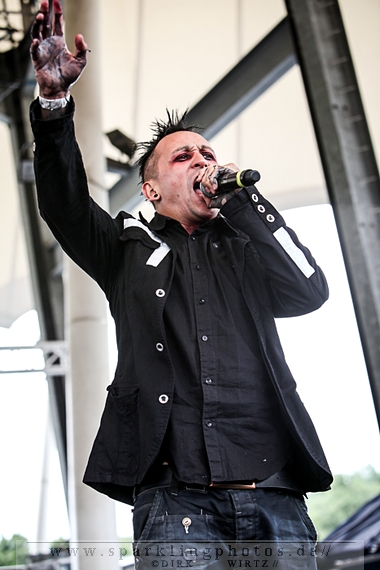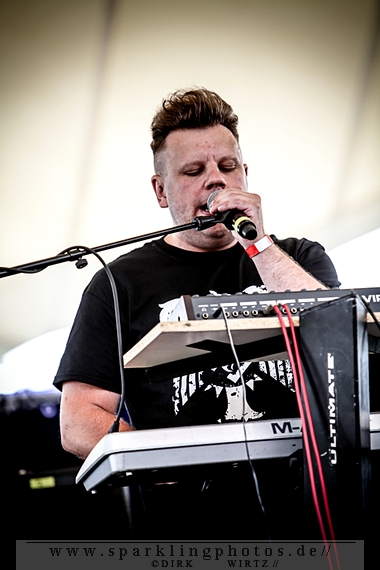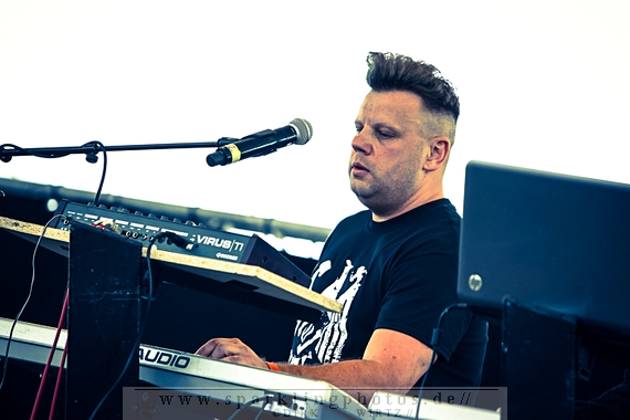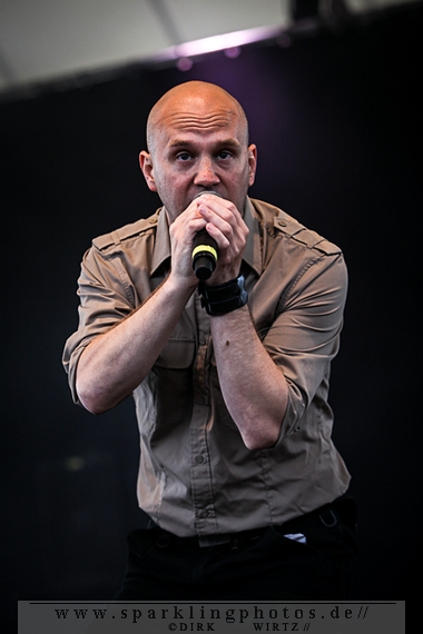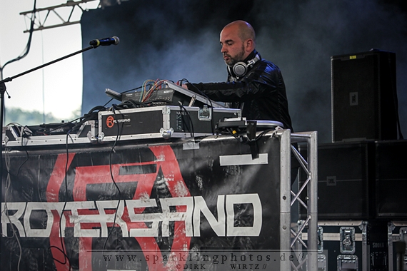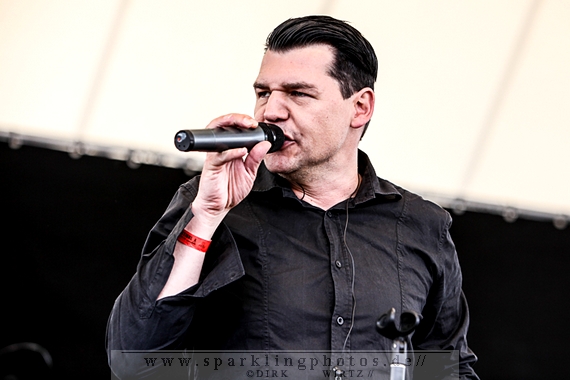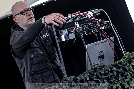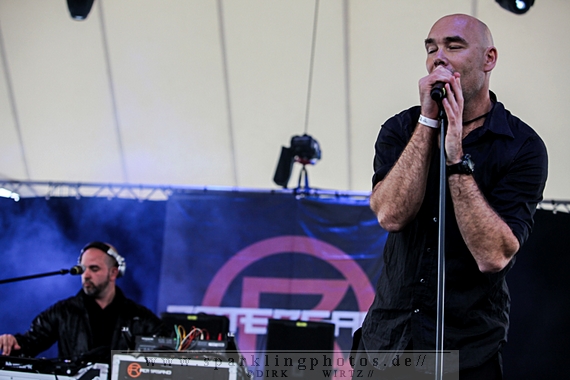Den dritten und letzten Tag des Blackfield eröffnen Godex [GALLERY] bei optimalem Festivalwetter. Mit Ost+Front [GALLERY] geht es danach etwas härter zur Sache. Zudem provozieren die NDH Metaller mit einer ziemlich blutigen Bühnenshow. Wesentlich ruhiger und gesitteter gestaltet sich dann der Auftritt von Die Kammer [GALLERY], bei dem sich einige der Frühaufsteher allerdings erst einmal auf die Suche nach Frühstück machen und der Platz vor der Bühne relativ leer bleibt. Das absolute Kontrastprogramm bieten dann Rabia Sorda [GALLERY] aus Mexiko. Sänger Erk Aicrag, der auch bei Hocico am Mirko steht, setzt alles daran das Publikum aufzuwecken, was ihm schließlich auch ganz gut gelingt. Noch elektronischer geht es bei Neuroticfish [GALLERY] zu. Das Projekt von Sascha Mario Klein überzeugt durch tanzbare Beats und sorgt trotz sommerlicher Temperaturen für Bewegung vor der Bühne. Von Future Pop geht es dann über zu EBM. Der französische Techno-Produzent und die Stimme von Nitzer Ebb fanden 2002 zusammen und gründeten das gemeinsame Musikprojekt Fixmer/McCarthy [GALLERY] und rocken nun ordentlich das Blackfield. Im gewohnten schwarzen Anzug und mit stylischer Pilotensonnenbrille fegt Douglas McCarthy dabei unentwegt über die Bühne und auch davor wird ordentlich gefeiert.