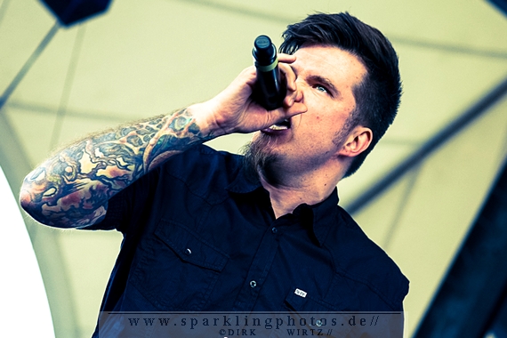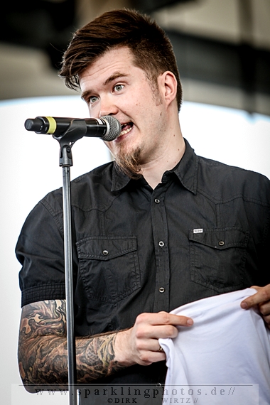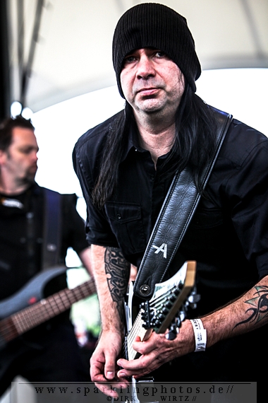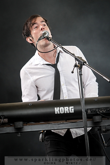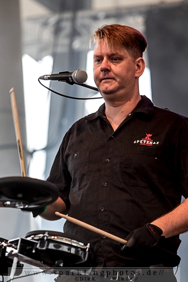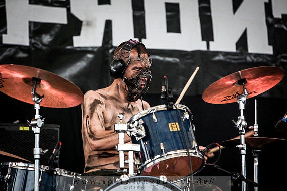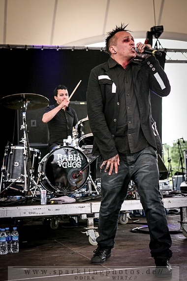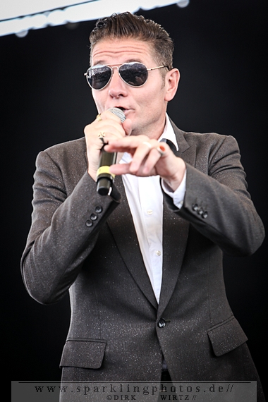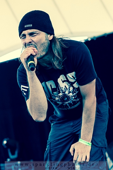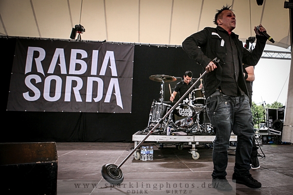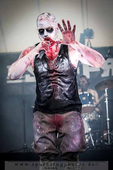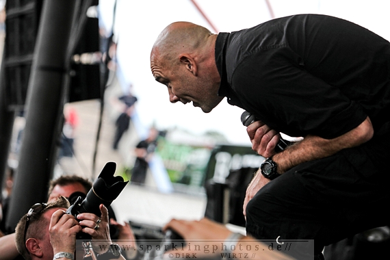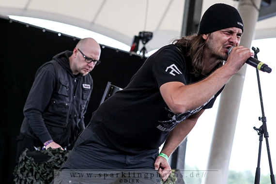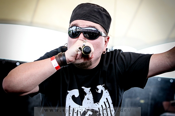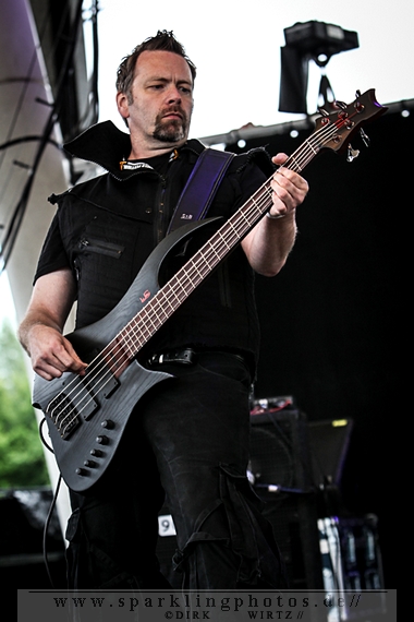 Den dritten und letzten Tag des Blackfield eröffnen Godex [GALLERY] bei optimalem Festivalwetter. Mit Ost+Front [GALLERY] geht es danach etwas härter zur Sache. Zudem provozieren die NDH Metaller mit einer ziemlich blutigen Bühnenshow. Wesentlich ruhiger und gesitteter gestaltet sich dann der Auftritt von Die Kammer [GALLERY], bei dem sich einige der Frühaufsteher allerdings erst einmal auf die Suche nach Frühstück machen und der Platz vor der Bühne relativ leer bleibt. Das absolute Kontrastprogramm bieten dann Rabia Sorda [GALLERY] aus Mexiko. Sänger Erk Aicrag, der auch bei Hocico am Mirko steht, setzt alles daran das Publikum aufzuwecken, was ihm schließlich auch ganz gut gelingt. Noch elektronischer geht es bei Neuroticfish [GALLERY] zu. Das Projekt von Sascha Mario Klein überzeugt durch tanzbare Beats und sorgt trotz sommerlicher Temperaturen für Bewegung vor der Bühne. Von Future Pop geht es dann über zu EBM. Der französische Techno-Produzent und die Stimme von Nitzer Ebb fanden 2002 zusammen und gründeten das gemeinsame Musikprojekt Fixmer/McCarthy [GALLERY] und rocken nun ordentlich das Blackfield. Im gewohnten schwarzen Anzug und mit stylischer Pilotensonnenbrille fegt Douglas McCarthy dabei unentwegt über die Bühne und auch davor wird ordentlich gefeiert.