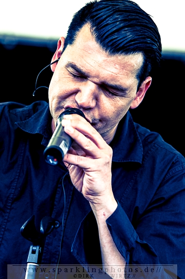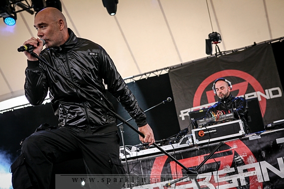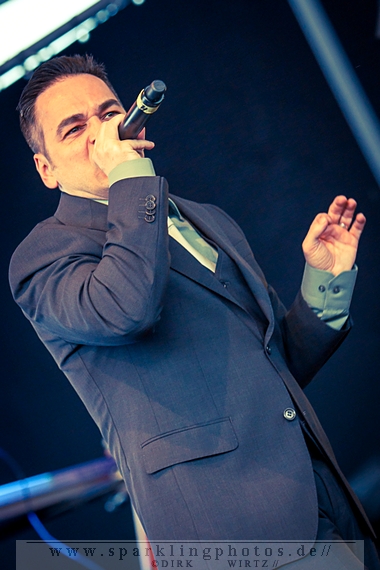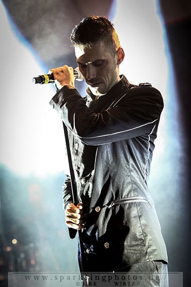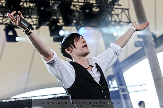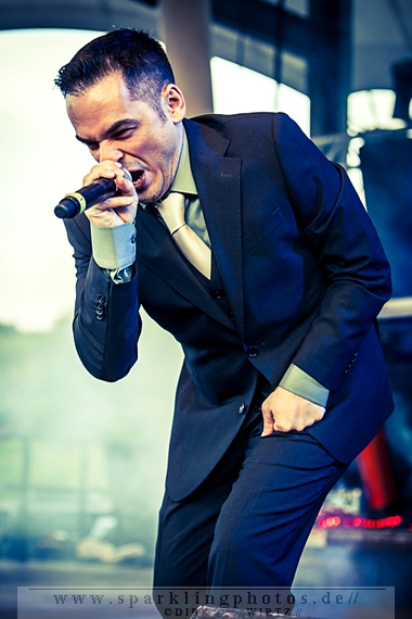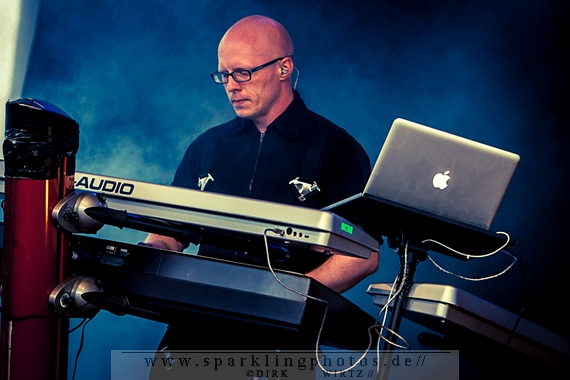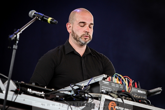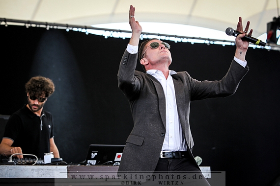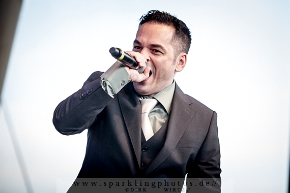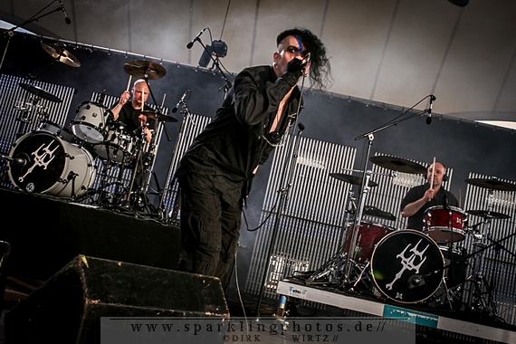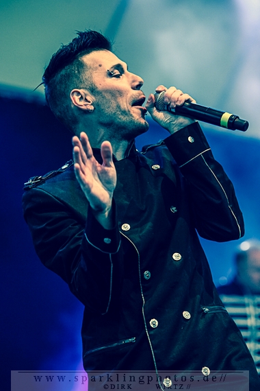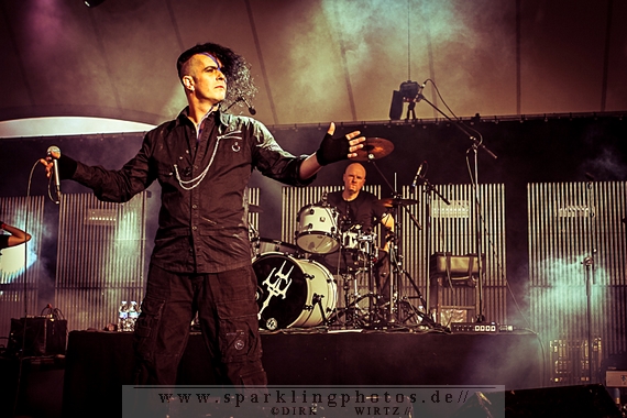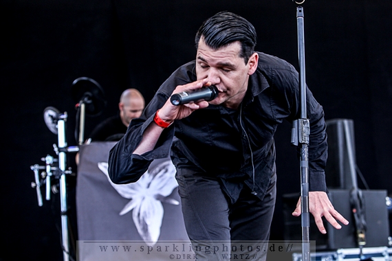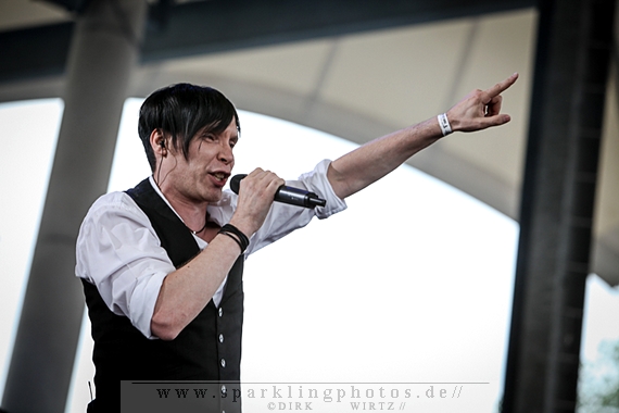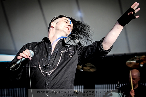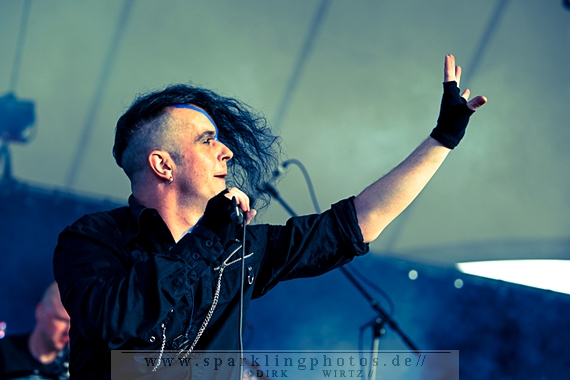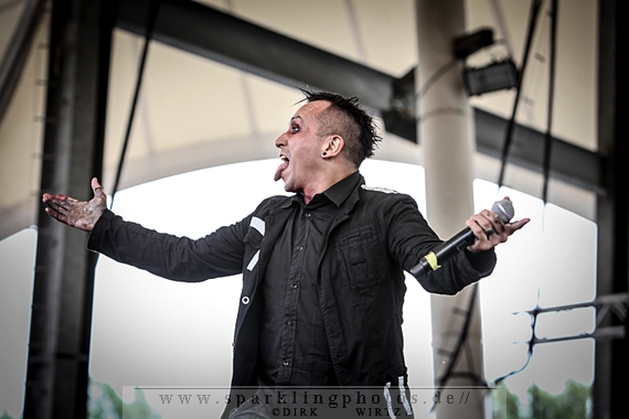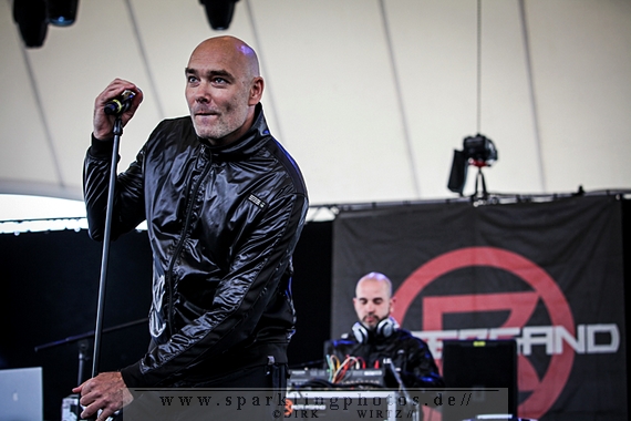 Co-Headliner am Samstag sind Project Pitchfork [GALLERY], die gerade von einer längeren US Tour zurückgekommen sind. Frontmann Peter Spilles hadert etwas mit der tiefstehenden Sonne und leiht sich kurzer Hand die Sonnenbrille von einem Fan in der ersten Reihe. Mit Songs wie Timekiller, Pitch Black, Steelrose und Rain hat die Band schnell das komplette Amphitheater im Griff. Überall sieht man tanzende, mitsingende Menschen. Mit drei Drummern auf der Bühne macht die Band aber auch ordentlich Druck. Zum Abschied kann sich Peter Spilles eine kleine Stichelei zum nachfolgenden Mainact nicht verkneifen. Mit etwas Verspätung betreten And One [GALLERY] gegen kurz nach halb Zehn die Bühne zu ihrem wahrscheinlich letzten Auftritt auf dem Blackfield. Ende des Jahres 2013 geht die Band wieder einmal auf Abschiedstournee. Dass Frontmann Steve Naghavi noch genug Power für viele weitere Konzerte hat zeigt sich dadurch, dass er unentwegt von einer Seite der Bühne zur anderen rennt und dabei wie ein Flummi umher hüpft. And One spielen Songs vom S.T.O.P. Album und ältere Hits wie Traumfrau, Steine sind Steine oder Metalhammer und bringen damit die gesamte Location zum Kochen. Mal abwarten ob es wirklich das Ende von Naghavi & Co. ist…