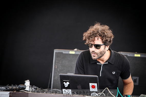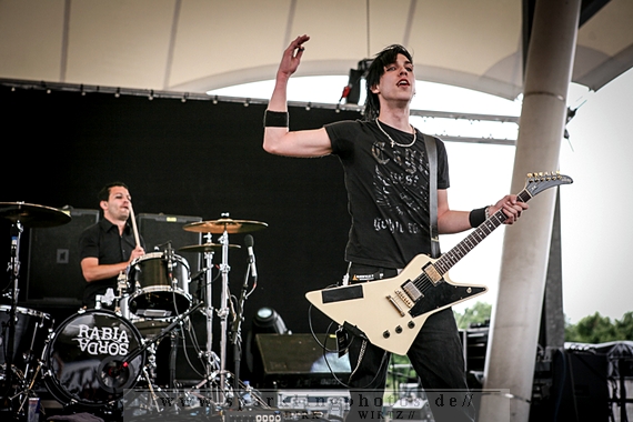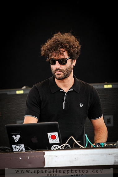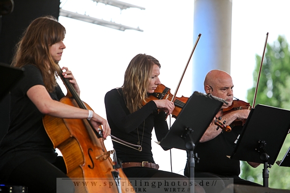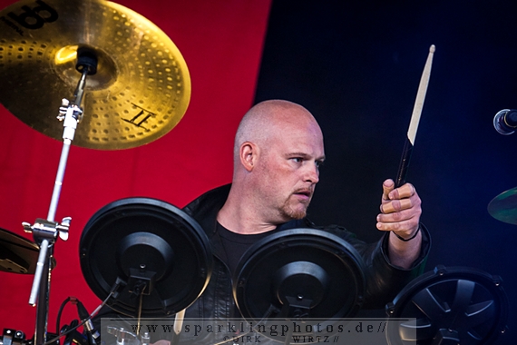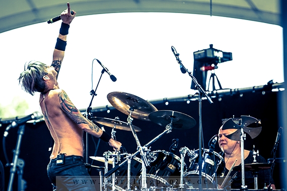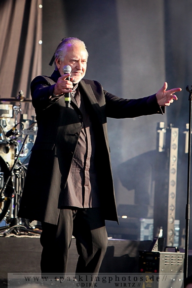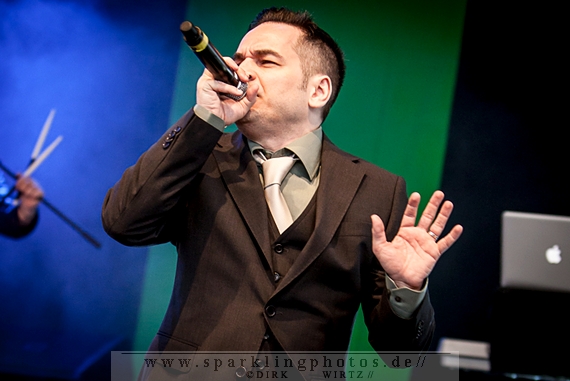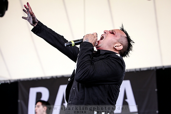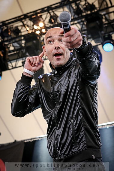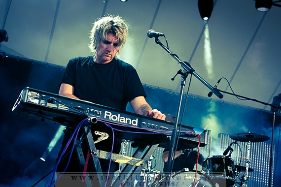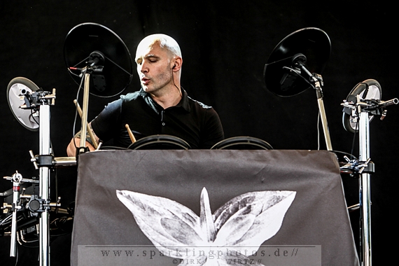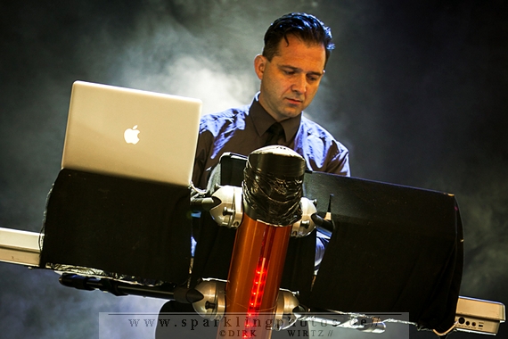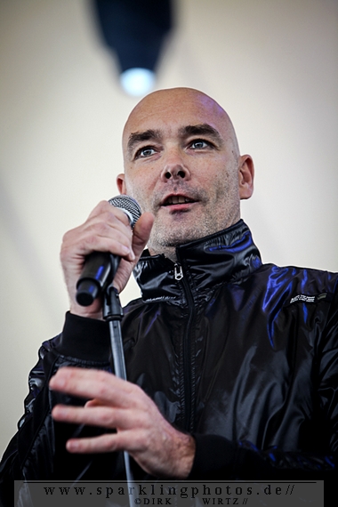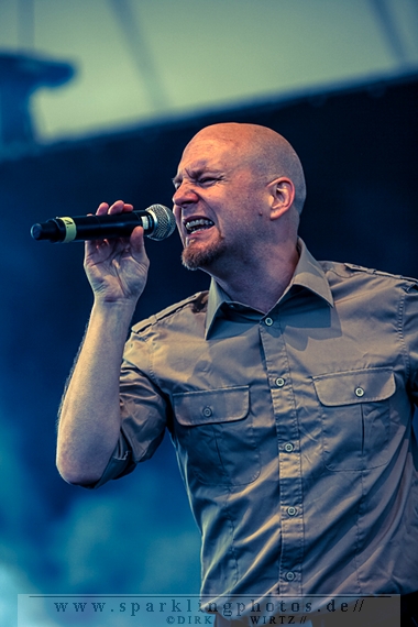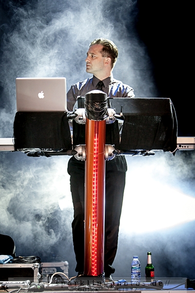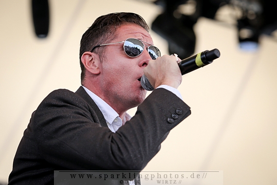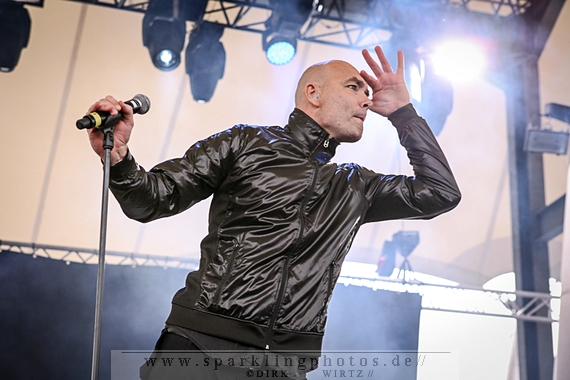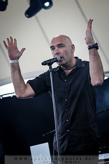 Co-Headliner am Samstag sind Project Pitchfork [GALLERY], die gerade von einer längeren US Tour zurückgekommen sind. Frontmann Peter Spilles hadert etwas mit der tiefstehenden Sonne und leiht sich kurzer Hand die Sonnenbrille von einem Fan in der ersten Reihe. Mit Songs wie Timekiller, Pitch Black, Steelrose und Rain hat die Band schnell das komplette Amphitheater im Griff. Überall sieht man tanzende, mitsingende Menschen. Mit drei Drummern auf der Bühne macht die Band aber auch ordentlich Druck. Zum Abschied kann sich Peter Spilles eine kleine Stichelei zum nachfolgenden Mainact nicht verkneifen. Mit etwas Verspätung betreten And One [GALLERY] gegen kurz nach halb Zehn die Bühne zu ihrem wahrscheinlich letzten Auftritt auf dem Blackfield. Ende des Jahres 2013 geht die Band wieder einmal auf Abschiedstournee. Dass Frontmann Steve Naghavi noch genug Power für viele weitere Konzerte hat zeigt sich dadurch, dass er unentwegt von einer Seite der Bühne zur anderen rennt und dabei wie ein Flummi umher hüpft. And One spielen Songs vom S.T.O.P. Album und ältere Hits wie Traumfrau, Steine sind Steine oder Metalhammer und bringen damit die gesamte Location zum Kochen. Mal abwarten ob es wirklich das Ende von Naghavi & Co. ist…
