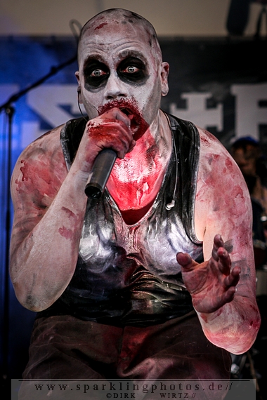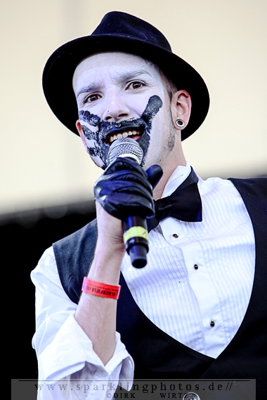 Für den finalen Auftritt wird dann reichlich auf der Bühne gewerkelt, will man doch den Zuschauern zum Abschluss noch etwas Besonderes bieten. Als dann endlich alles steht betreten Eisbrecher [GALLERY] die Festivalbühne in Gelsenkirchen. Checker Alex Wesselsky im schwarzen Anzug, pinkfarbener Krawatte, Cowboyhut
