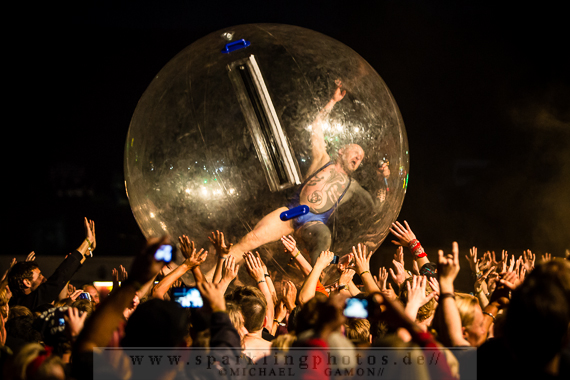 Wieder etwas weniger hart, dafür mit einem gehörigen Schuss Verrücktheit geht es mit Knorkator weiter. Statt Basti ist heute Jennifer am Bass zu finden, ansonsten ist alles wie gehabt, und das ist gut so! Nachdem sich Sänger Stumpen zunächst aus einem Bild erstreckt und sich dann aus seinem bunten Strampelanzug geschält hat, besitzt er endlich die volle Bewegungsfreiheit und es kann so richtig losgehen. Der Spaß steht im Vordergrund und angesichts so manches skurrilen Textes wird im Publikum geschmunzelt, gelacht und vor allem aber gerockt. Auch stimmlich wird so allerhand geboten, sei es Dank der unnachahmlichen Kopfstimme von Stumpen bei Songs wie Ich lass mich klonen, oder dem dunklen Organ von Alf Ator, der natürlich bei Böse von allerlei ach so schlimmen Schandtaten berichtet. Dieser Song ist auch showtechnisch in einem eh schon abwechslungsreichen Programm der Höhepunkt, denn während Alf „beichtet“, lässt sich Stumpen in einer großen Kugel über die Köpfe des Publikums hinweg von selbigem tragen. Bevor man aber angesichts der schockierenden Sünden Alfs denken könnte, dass Knorkator wirklich von Grund auf böse sind, entkräften sie diese Gedanken ganz schnell mit einer ganz eigenen Form der Wall Of Death, bei der die Zuschauer ganz langsam aufeinander zugehen und sich die Hand geben sollen. Das Publikum scheint dies nach Ansicht von Stumpen allerdings im Gegensatz zu ihm selbst nicht verstanden zu haben und so folgt folgerichtig Du Nicht, bei dem ordentlich gepogt wird und danach Kurz Und Klein, bei dem dann auch eine Gitarre dran glauben muss… wer von Zerstörung singt, muss wohl auch Zerstörung bringen 😉 Ersatzfrau Jennifer wird wenig später noch die Ehre zu teil, die Zweit- oder besser Drittstimme bei Wir Werden Alle Sterben zu übernehmen, womit auch das Mainset endet. Einzige Zugabe ist Warum, bei dem Stumpen noch einmal seine Kopfstimme zum Äußersten reizt und sich die Band danach leider verabschiedet. Warum???
