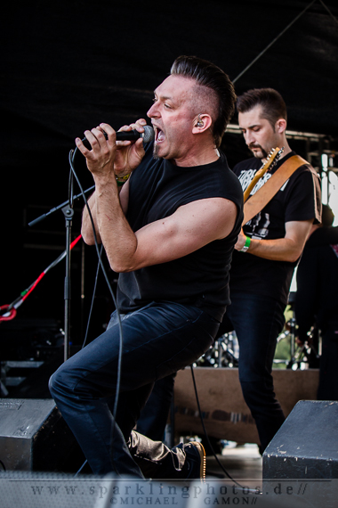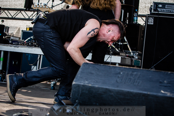 Zu Grave Digger füllt sich das Gelände, insbesondere vor der Bühne, nun merklich. Die Band stammt aus Gladbeck und damit ganz aus der Nähe – quasi ein Heimspiel und das merkt man auch! Es herrscht eine klasse Stimmung vor der Bühne und auch die Akteure selbst hängen sich richtig rein, posen viel und zeigen auf der Bühne Spielspaß pur. Und wo wir schon einmal hier sind, kann man auch gleich mal ein bisschen persönlich werden und mit Wedding Day ein Lied über eine Frau aus Dorsten intonieren, von der Fronter Chris Boltendahl damals mal verarscht wurde. Eher auf die musikalische Vergangenheit zielt dann Excalibur mit dem die Band eine Reise in die Neunziger unternimmt. Dann steht uns Großes bevor, denn einer der bedeutendsten Welthits der Metalgeschichte wird angekündigt: Rebellion. Die Fans sind begeistert und rufen nach dem Song schnell nach einer Zugabe und sie sollen drei weitere Stücke bekommen, wobei Heavy Metal Breakdown natürlich der krönende Abschluss ist.