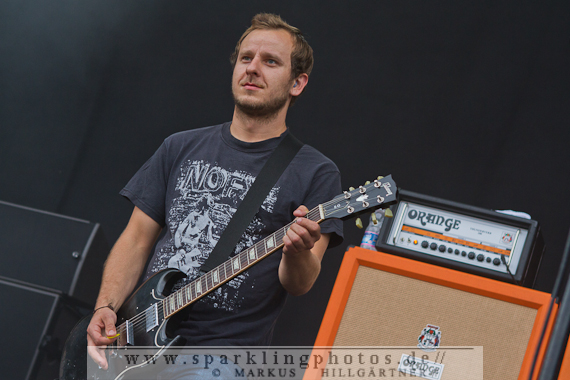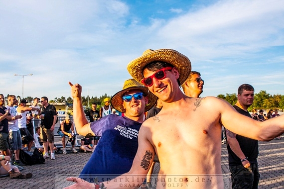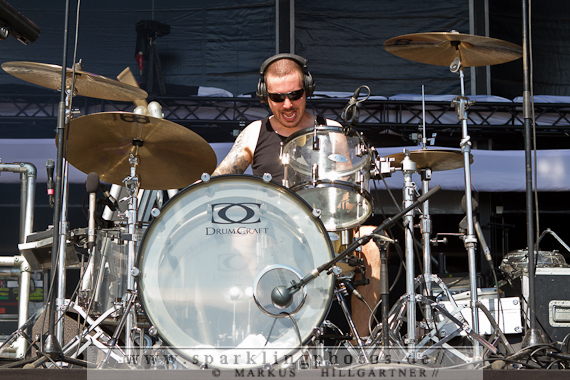 Die erste musikalische Huldigung an den Wettergott brachten Callejon [GALLERY] dar. Auch wenn besorgte Stimmen äußerten, dass uns eventuell der Himmel auf den Kopf fallen könnte (Wer Sparklingphotos.de regelmäßig verfolgt weiß, dass das Kölner Konzert wegen dem Herabfallen von Teilen der Decke abgebrochen werden musste) brachen die Schleusen noch nicht und man konnte sich trockenen Fußes auf den letzten Tag einstimmen lassen.