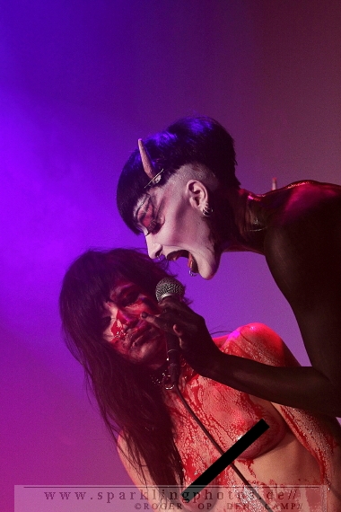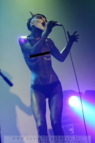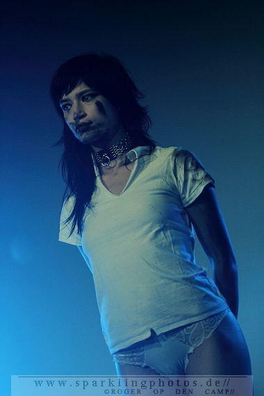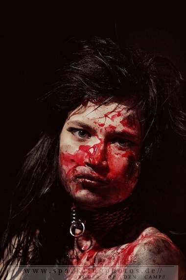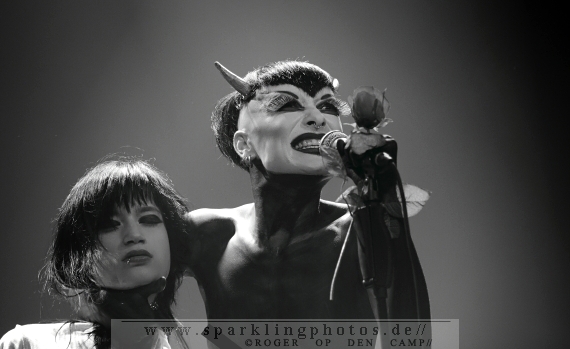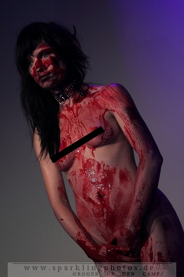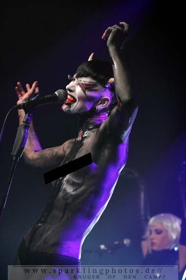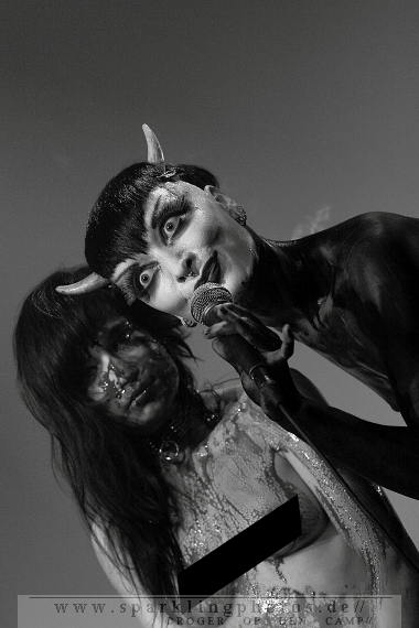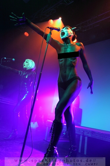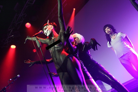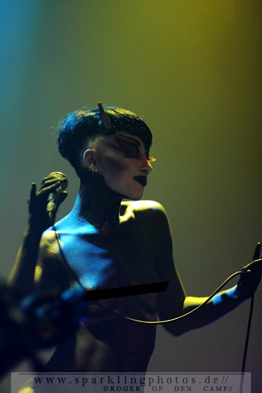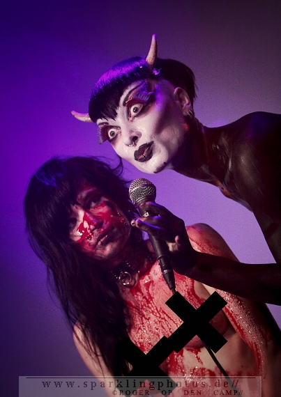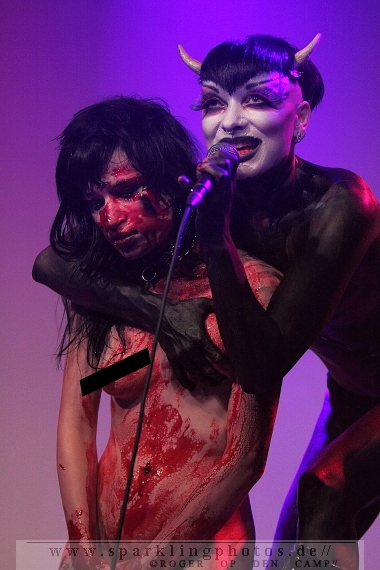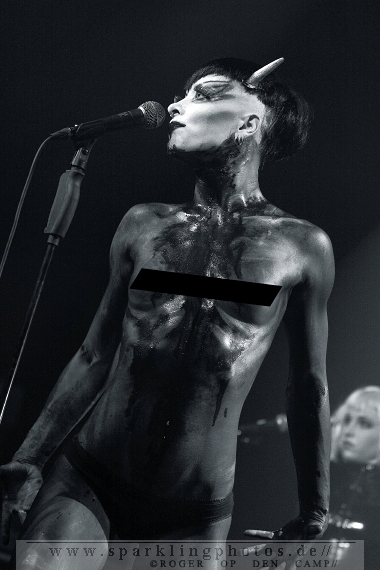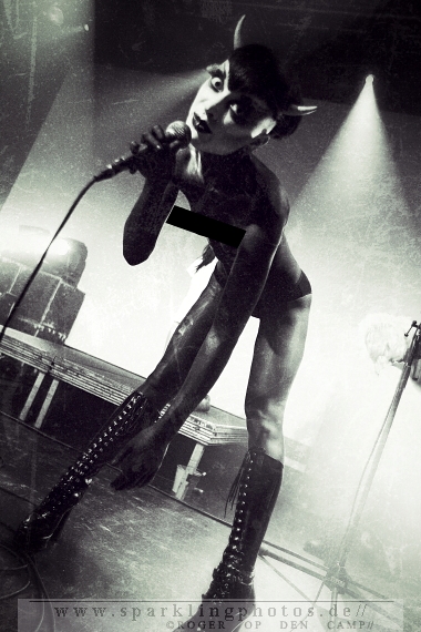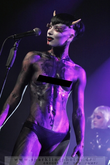 Als nächstes stehen Grausame Töchter auf dem Programm und was sie da auf der Bühne machen, ist schon etwas ganz Spezielles. Ihre Musik wird von einer extravaganten Show unterstützt und sie ziehen damit alle Aufmerksamkeit voll auf sich. Man merkt sofort, dass die Niederlande ein offenes Land sind und daher sind sogar einige Jugendliche zugelassen, allerdings natürlich in Begleitung eines Erwachsenen. Auch wenn es hier nackte Körper zu sehen gibt, wirkt das nicht unbedingt obszön oder gar inakzeptabel. Auch Sängerin Aranea Peel zeigt sich uns nur wenig verhüllt. Ihr Körper ist schwarz bemalt, das Gesicht ist weiß, was besonders ihre Augen und ihren Ausdruck betont. Ihre Gesichtsausdrücke sind fantastisch und lassen uns an Nina Hagen denken. Den Bassisten hatten wir hingegen gestern schon bei Pre/Verse gesehen. Die Musik der Grausamen Töchter fällt in die Dark Electro-Punk Sparte, angereichert mit einem gehörigen Schuss Cabaret. Einige Lieder die sie spielten waren: Rosen für dich, Therapie, Für Dich und Ich Darf Das. Natürlich darf sie das…