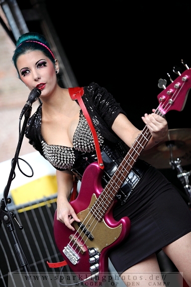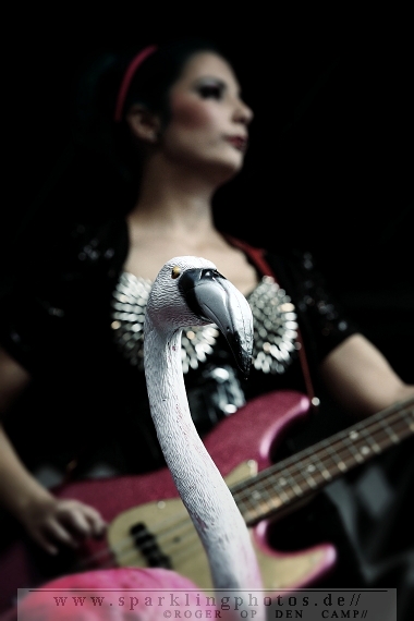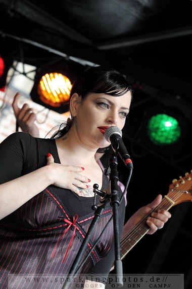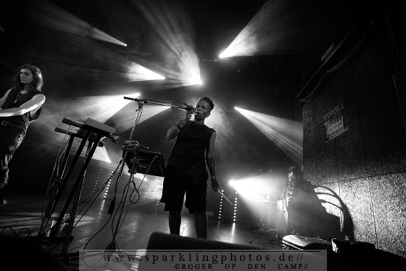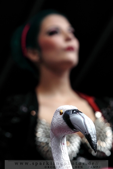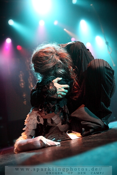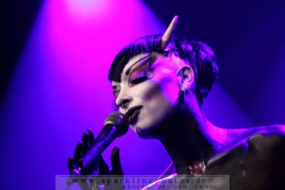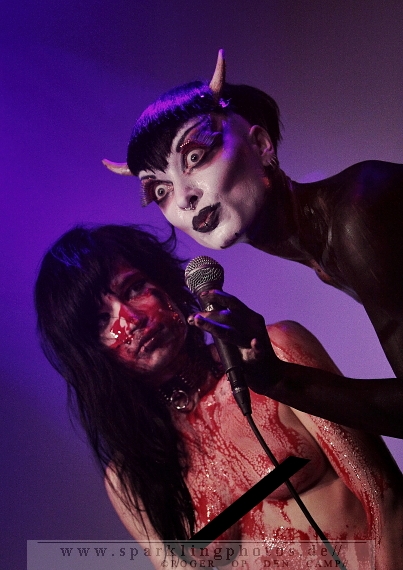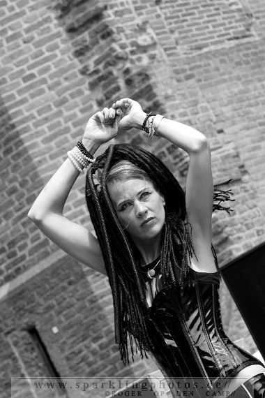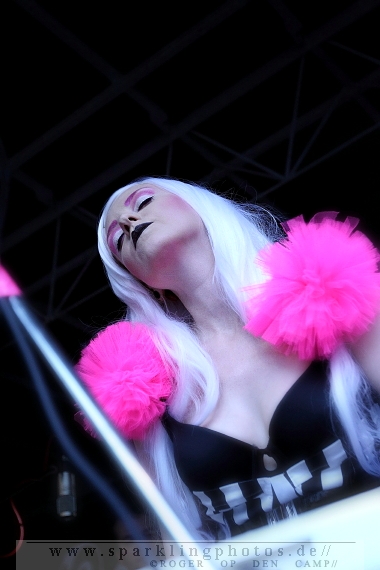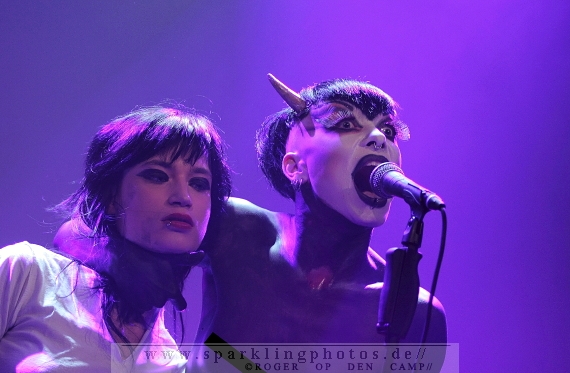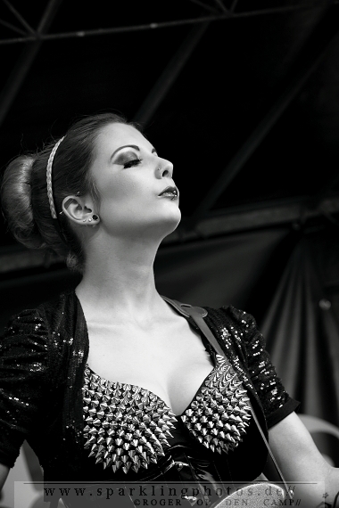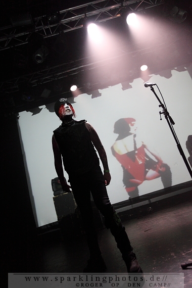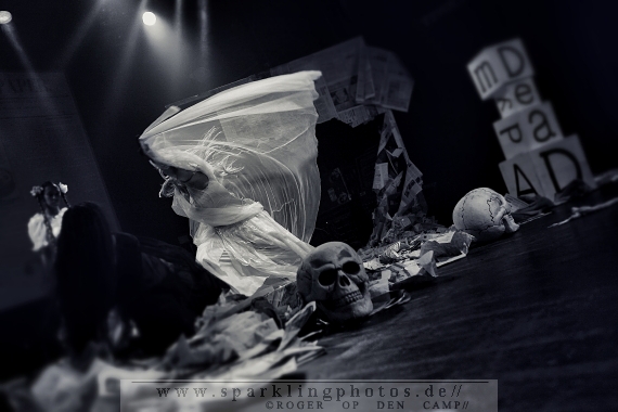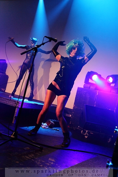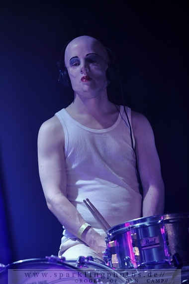 Als nächstes stehen Grausame Töchter auf dem Programm und was sie da auf der Bühne machen, ist schon etwas ganz Spezielles. Ihre Musik wird von einer extravaganten Show unterstützt und sie ziehen damit alle Aufmerksamkeit voll auf sich. Man merkt sofort, dass die Niederlande ein offenes Land sind und daher sind sogar einige Jugendliche zugelassen, allerdings natürlich in Begleitung eines Erwachsenen. Auch wenn es hier nackte Körper zu sehen gibt, wirkt das nicht unbedingt obszön oder gar inakzeptabel. Auch Sängerin Aranea Peel zeigt sich uns nur wenig verhüllt. Ihr Körper ist schwarz bemalt, das Gesicht ist weiß, was besonders ihre Augen und ihren Ausdruck betont. Ihre Gesichtsausdrücke sind fantastisch und lassen uns an Nina Hagen denken. Den Bassisten hatten wir hingegen gestern schon bei Pre/Verse gesehen. Die Musik der Grausamen Töchter fällt in die Dark Electro-Punk Sparte, angereichert mit einem gehörigen Schuss Cabaret. Einige Lieder die sie spielten waren: Rosen für dich, Therapie, Für Dich und Ich Darf Das. Natürlich darf sie das…