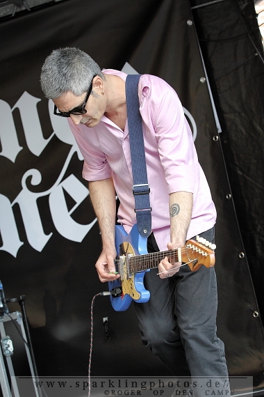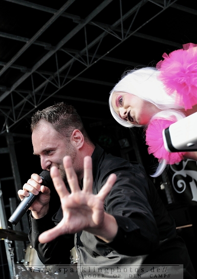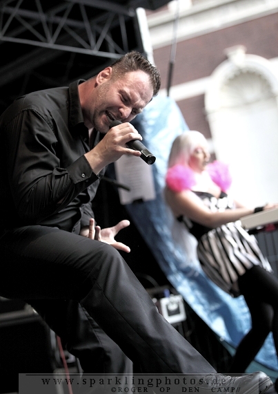 Einer meiner größten Favoriten des diesjährigen Summer Darkness sind sicherlich Apoptygma Berzerk. Und in diesem Sommer ist sogar Gitarrist Audun "Angel" Stengel wieder bei APOP mit dabei. Der Sound ist sehr hart, aber wenn man die vertrauten Songs hört, denkt man darüber nicht länger nach. Mit Nonstop Violence starten sie sofort in Partystimmung. Sänger Stephan Groth betont mehrmals dass es sehr heiß ist, dennoch geht er mit Enthusiasmus an die Sache.