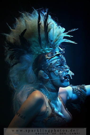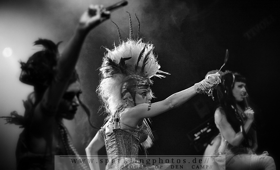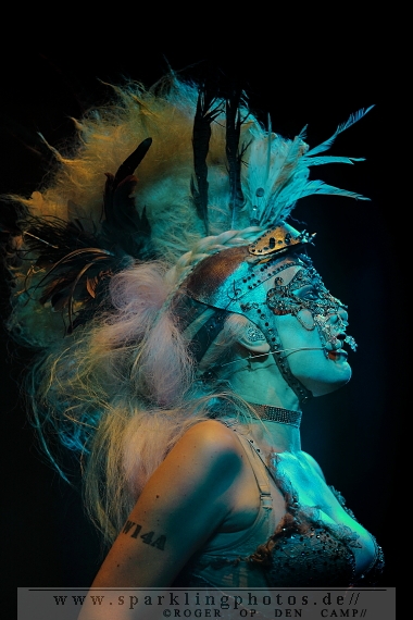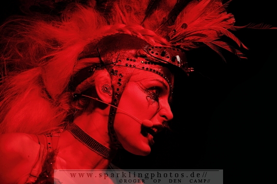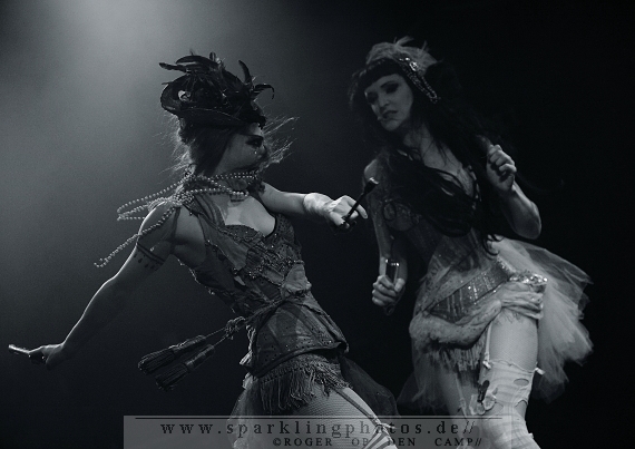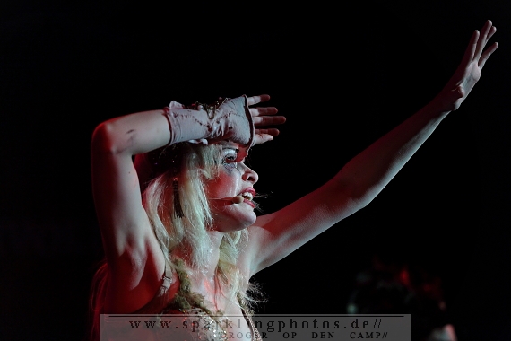 Wir wissen längst, dass Emelie eine gute Violinistin ist, doch heute Abend nimmt sie dieses Instrument nicht in die Hand. Ihr Gesang ist einzigartig und hat einen stimmlich besonderen Stil. Die Musik kommt vom Band, daher wäre es schön, einige Violinenstücke dazu live zu hören. Aber der Schwerpunkt des Konzertes liegt heute in der Show. Die dennoch nicht so umfangreich ist, wie die, die wir letztes Jahr sehen konnten. Das Drumherum fällt nicht so überschwänglich aus wie gewohnt und es sind dieses Mal nur zwei Bloody Crumpets Mitglieder am Start: Maggie und Veronica.