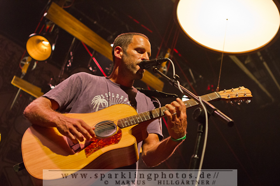 Bald war es dann auch so weit und Johnson betrat unter großem Applaus die Kölner Bühne. Mit dabei hatte er seine aus Merlo Podlewski (Bass), Adam Topol (Schlagzeug) und Zach Gill (Piano und andere Instrumente, sowie Gesang) bestehende Band. Jedes Bandmitglied war schnell an seinen Platz und auch Jack Johnson griff sofort nach seiner Gitarre und nahm unter einer überdimensionierten Wohnzimmerlampe seine Position ein.