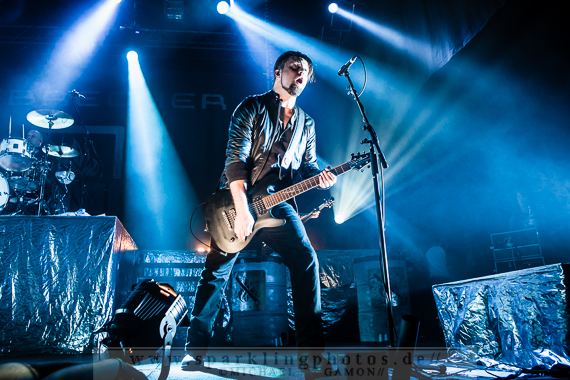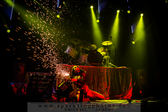 Aber ganz so simpel ist es sicherlich nun auch nicht. Gerade an den durchdachten Kleinigkeiten wird die Liebe zum Detail, die sich ja auch auf der Haut und in jeder Note wiederfindet, sichtbar. Die Mitsubishi Electric Halle in Düsseldorf ist nahezu zweigeteilt. Auf der einen Seite sind die vielen bunten Stände und auf der anderen Seite, die durch die aufgehängten Tücher schön verdunkelt ist und somit auch das Konzerterlebnis wesentlich atmosphärischer gestaltet, die Bühne auf der gerockt werden darf. Leinwände, die dem Besucher auch im Storebereich einen Blick auf die Bühne gewähren, sind wohlbedacht aufgestellt.