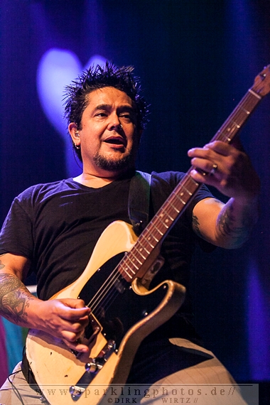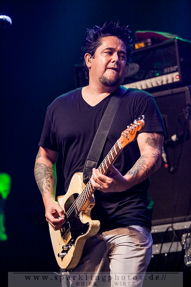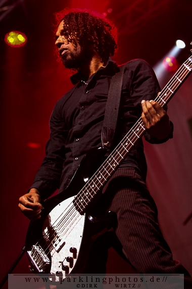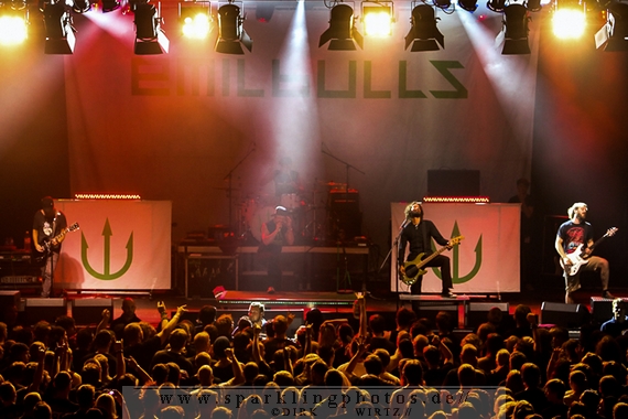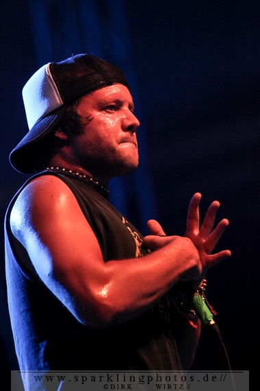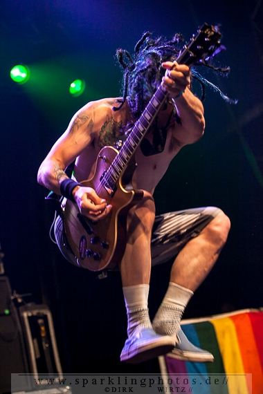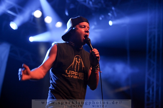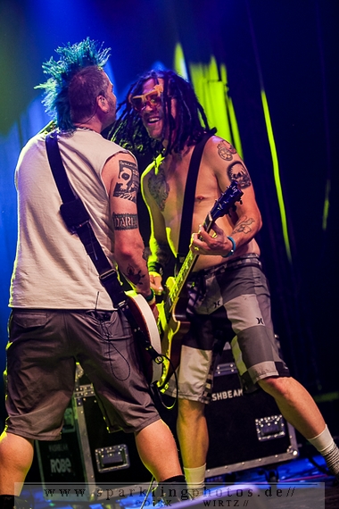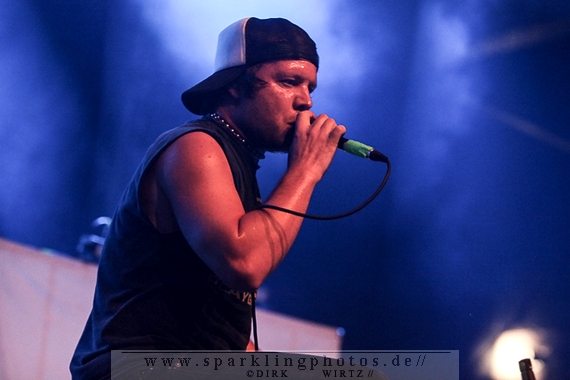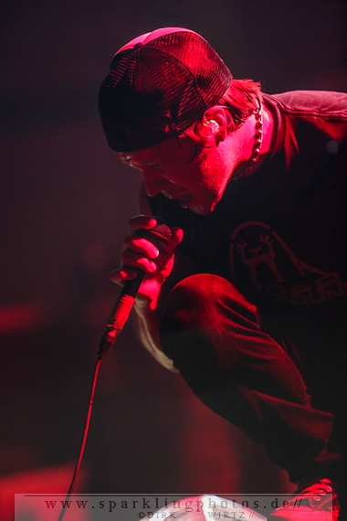 für die Münchener Emil Bulls [GALLERY]. Waren Betontod noch mit einer riesigen Lichtshow unterwegs, gaben sich die Münchener sehr lichtscheu. Die Bühnenbeleuchtung abgedunkelt und das Frontlicht ausgeschaltet, gaben die Jungs ihre Songs zum Besten. Eigentlich schade, passt so eine dunkle Bühne so gar nicht zu ihrer powervollen Musik.Arme hoch bei den Briten Skindred [GALLERY]. Die Jungs, in deren Musik Punk, Metal, Hiphop und Reggae genial vereint sind, brachten den Mob schnell in Wallung. Die Fans schwenkten die Arme im klassischem HipHop Style, der wuchtige (körperlich und gesanglich) Sänger Benji Webbe animierte hervorragend das Publikum. Die Musik erreichte ziemlich alle in der Halle, die zu dem Zeitpunkt im Grunde bis zum letzten Platz gefüllt war. Vollmundig in Gesang und Gitarre, kann man da nur staunend resümieren, wenn man die Band noch nicht Live erlebt hat. Benji Webbe hat echt eine tolle Livestimme, die könnte auch bei jeder ambitionierten Reggae Band zum Einsatz kommen, HipHop ist ebenfalls sehr gut vorstellbar. Nach einem tollen Auftritt verlassen Skindred die Bühne, um Platz zu machen für die schwedischen Skatepunker Millencolin [GALLERY]. Der erfrischende Punkrock mit stark melodiösem Einschlag lässt viele Herzen in der Halle höher schlagen, erinnern sich hier doch viele Leute noch an den sensationellen Aufstieg der vier Schweden Mitte der Neunziger Jahre. Die Show ist mit sehr viel Bewegung auf der Bühne verbunden. Vor allem Gitarrist Matthias Färm rutscht nicht nur einmal auf Knien über die Bühne und posiert mit der Gitarre wie ein alter Glam-Rocker. Das macht sehr viel Spaß und lässt den Auftritt viel zu schnell vorüberziehen. Hut ab, sehr gute Show.