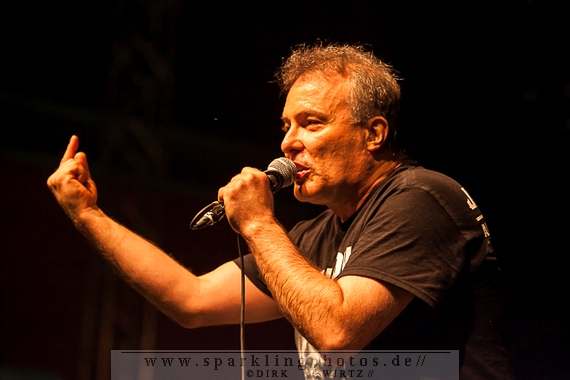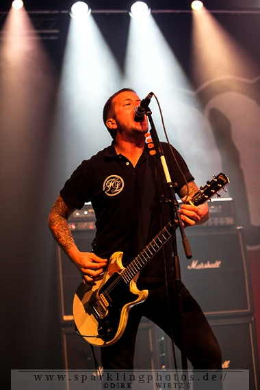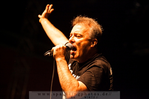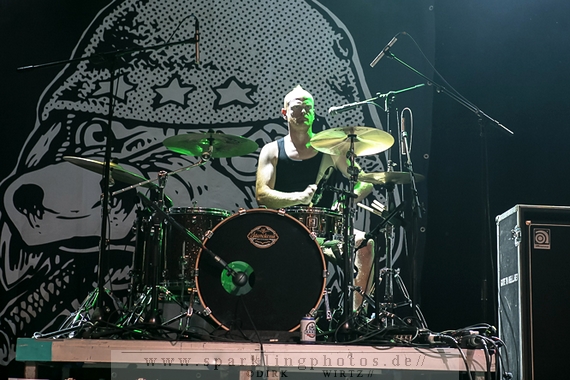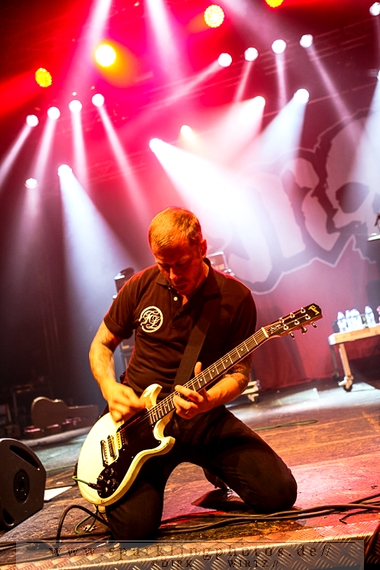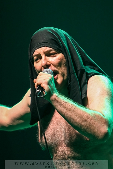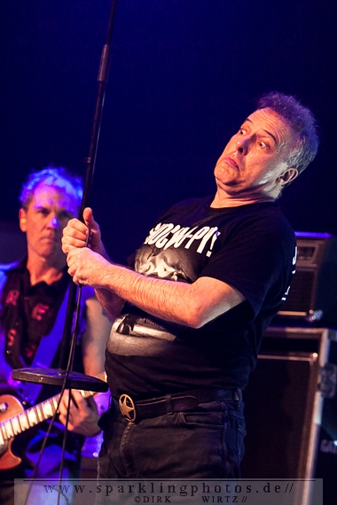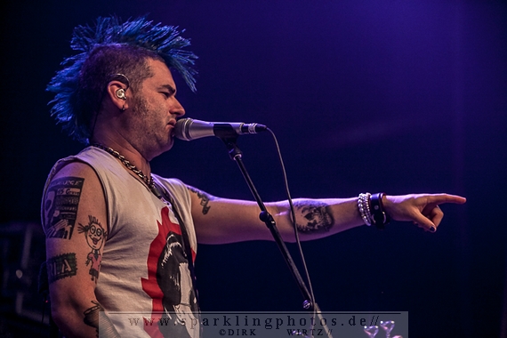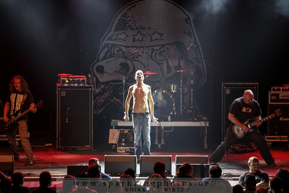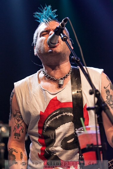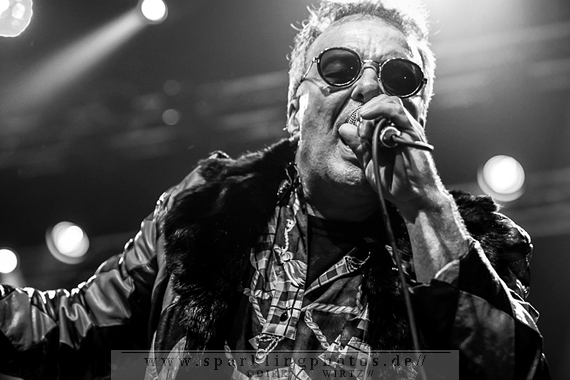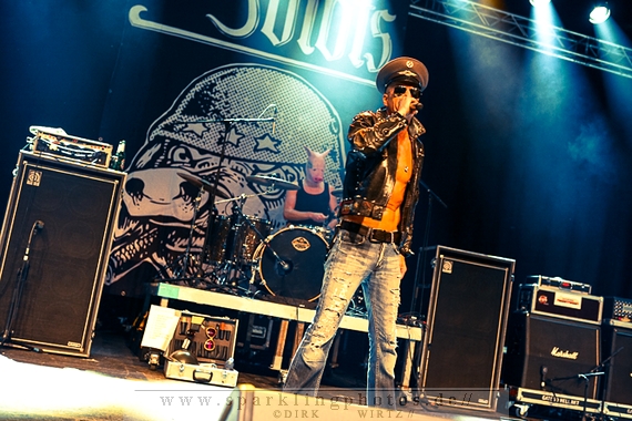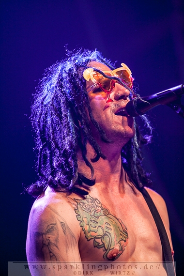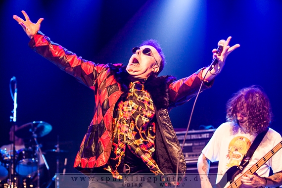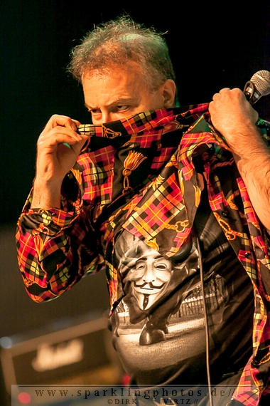 Nach der Umbaupause betrat dann Jello Biafra [GALLERY] die Bühne. Endlich. Wie lange war der Mann nicht in Deutschland auf der Bühne zu sehen!? Ein wenig in die Jahre gekommen, aber immer noch voller Power. Im coolen, multifarbenen Flickenmantel mit Pelzkragen, darunter ein Shock-u-py Shirt mit der Anonymus-Maske drauf, sowie einer John Lennon-Sonnenbrille auf der Nase, sprang er auf der Bühne herum. Obwohl es aktuell auch ein neues Album von „Jello Biafra and the Guantanamo School of Medicine“ – so der aktuelle Name der Biafra-Band – gibt, tun es natürlich immer wieder gerne die Evergreens der leider vergangenen Dead Kennedys-Ära. Alles, was der geneigte Jello Biafra-Fan zu hören wünscht, wurde gespielt. Von California Über Alles und Holiday in Cambodia“ bis hin zum gefeierten Nazi-Punks Fuck Off. Das alles gepaart mit den für Jello Biafra typischen, minutenlangen Dialogen, in denen er das Publikum von der Falschheit des amerikanischen Systems zu überzeugen versucht. Hier dreht es sich in erster Linie um das, seiner Ansicht nach, korrupte amerikanische Wirtschafts- und Bankensystem. "against the banker and the government" ist hier seine Kernaussage und so kennt man ihn auch seit Jahrzehnten. Er redete und sang sich regelrecht in einen Rausch, sprang sogar zweimal ins Publikum, welches ihn wohlwollend aufnahm und crowdsurfend wieder auf die Bühne zurückwarf. Herrlich. Ganz großes Kino. Solche Typen braucht’s im Punk’n’Roll-Businness.