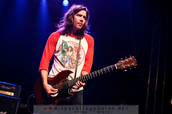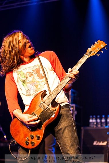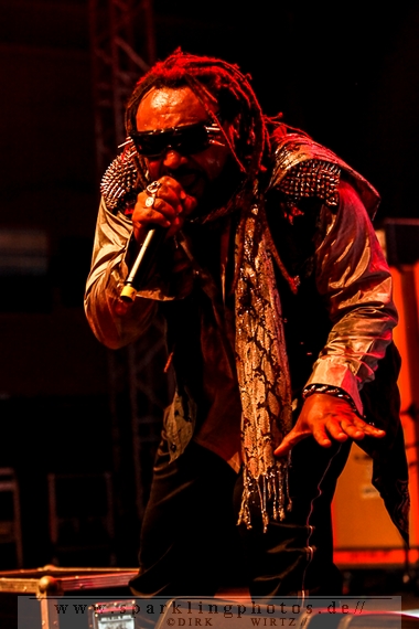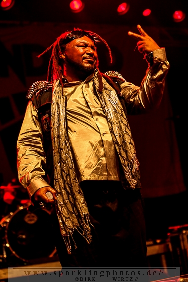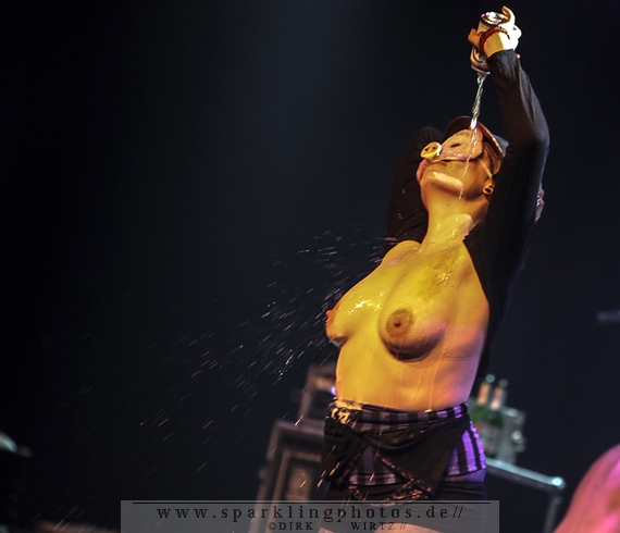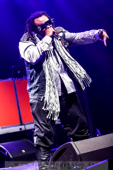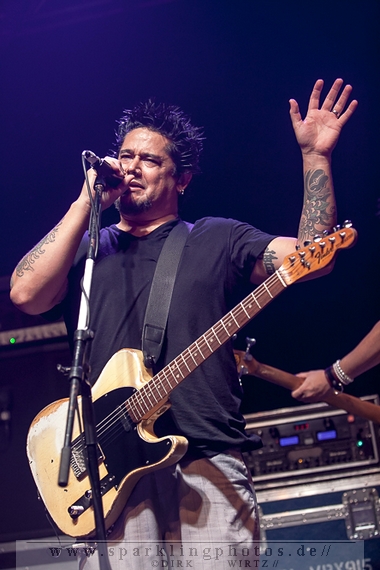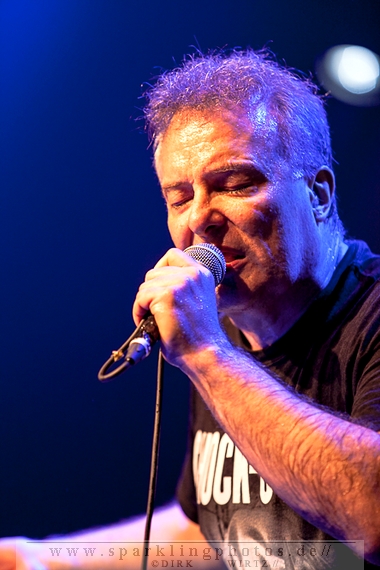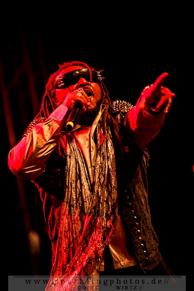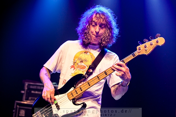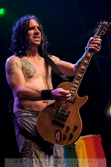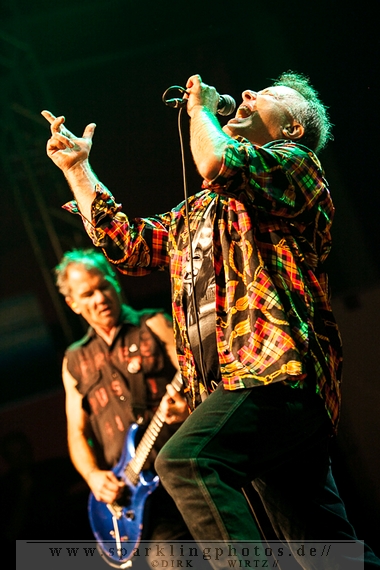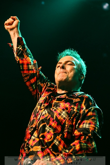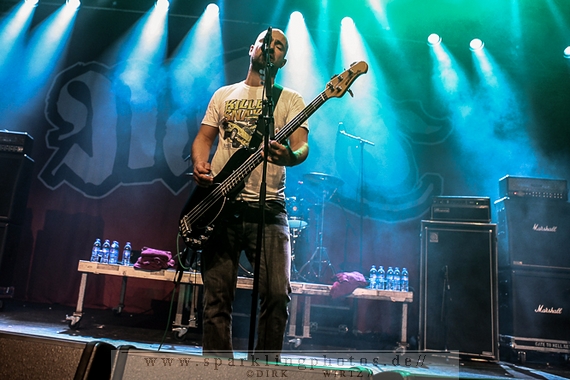 Nach der Umbaupause betrat dann Jello Biafra [GALLERY] die Bühne. Endlich. Wie lange war der Mann nicht in Deutschland auf der Bühne zu sehen!? Ein wenig in die Jahre gekommen, aber immer noch voller Power. Im coolen, multifarbenen Flickenmantel mit Pelzkragen, darunter ein Shock-u-py Shirt mit der Anonymus-Maske drauf, sowie einer John Lennon-Sonnenbrille auf der Nase, sprang er auf der Bühne herum. Obwohl es aktuell auch ein neues Album von „Jello Biafra and the Guantanamo School of Medicine“ – so der aktuelle Name der Biafra-Band – gibt, tun es natürlich immer wieder gerne die Evergreens der leider vergangenen Dead Kennedys-Ära. Alles, was der geneigte Jello Biafra-Fan zu hören wünscht, wurde gespielt. Von California Über Alles und Holiday in Cambodia“ bis hin zum gefeierten Nazi-Punks Fuck Off. Das alles gepaart mit den für Jello Biafra typischen, minutenlangen Dialogen, in denen er das Publikum von der Falschheit des amerikanischen Systems zu überzeugen versucht. Hier dreht es sich in erster Linie um das, seiner Ansicht nach, korrupte amerikanische Wirtschafts- und Bankensystem. "against the banker and the government" ist hier seine Kernaussage und so kennt man ihn auch seit Jahrzehnten. Er redete und sang sich regelrecht in einen Rausch, sprang sogar zweimal ins Publikum, welches ihn wohlwollend aufnahm und crowdsurfend wieder auf die Bühne zurückwarf. Herrlich. Ganz großes Kino. Solche Typen braucht’s im Punk’n’Roll-Businness.