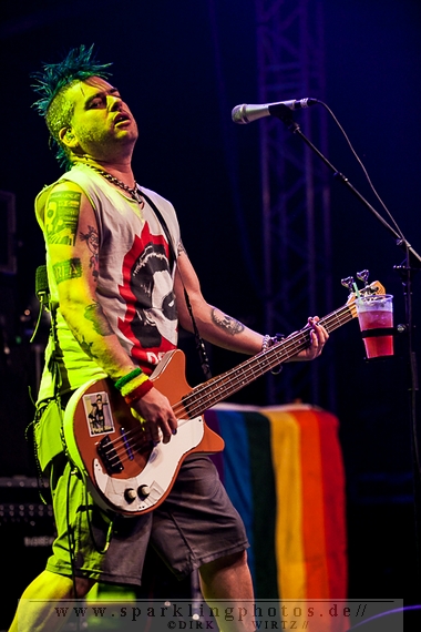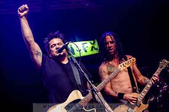 Zu guter Letzt kommen nun die Altstars von NOFX [GALLERY] auf die Bühne. In ihrer typischen Art konversieren sie erst mal ausgiebig mit dem Publikum. Getränke werden in die erste Reihe ausgegeben und man nimmt kleine Geschenke der Fans entgegen. Da fliegt dann auch eine Spaßbrille in Form von zwei Cocktailgläsern auf die Bühne, welche sich Sänger Fat Mike und Gitarrist Eric Melvin sofort mit großem Grinsen auf die Nase setzen. Hier und da werden sich einzelne Leute aus der Menge ausgesucht, die sich für ihr T-Shirt oder andere Sachen rechtfertigen müssen. Natürlich alles auf einer sehr spaßigen Ebene. Musik spielen die Jungs übrigens auch, und das natürlich in exzellenter Punkrockmanier. Keiner ist eher nach Hause gegangen, alle verweilen beim Headliner, der ein Würdiger ist. Neben all time Favoriten wie Linoleum oder 72 Hookers gab es auch das Rancid Cover Radio sowie das traditionelle Champs Elysées. Zum krönenden Abschluss eines sehr gelungenen Auftritts darf der wohl bekannteste Song der Jungs nicht fehlen: Kill All The White Man setzt einen Schlusspunkt unter ein gelungenes Festival.