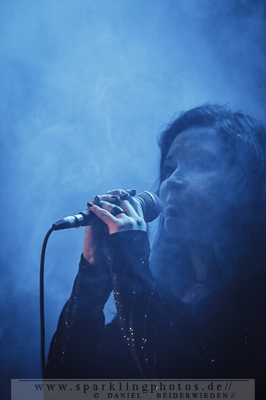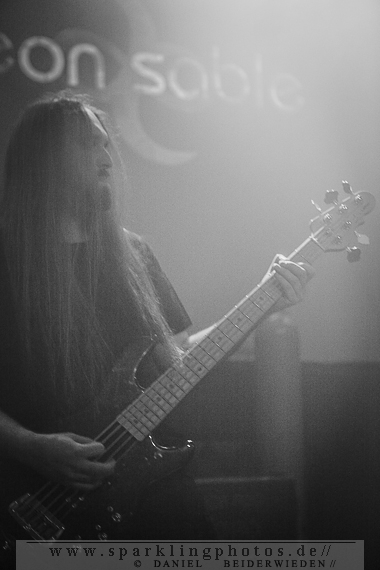 Nach dem Einlass ging es direkt nach hinten in Richtung Bühne, wo es nach Räucherstäbchen duftete. Durch den Nebel, die wenigen Lichtsports und diesen Duft lag sofort eine angenehme Atmosphäre im Raum. Diese schon vor dem Konzert herrschende düstere Atmosphäre war wirklich klasse und machte Lust auf mehr. Nach einigen Minuten des Wartes ging es los und Aeon Sable trat auf die Bühne. Sie starteten mit einem Gitarrensolo und noch viel mehr Nebel, welcher bei Aeon Sable als Stilmittel eingesetzt wird und für die sehr schöne Atmosphäre mitverantwortlich zeichnet. Immer mehr Menschen betraten nun den Raum, ließen aber zunächst vorne noch einen gewissen Sicherheitsabstand zur Bühne. Störend war dies im Konzertverlauf aber nicht, denn der vom Bühnenboden langsam ins Publikum hineinkriechende Nebel sah richtig cool aus.