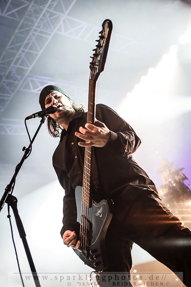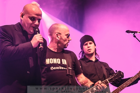 Nach einer Umbaupause begann dann mit einem dramatischen Intro der Auftritt von Mono Inc. selbst. Die Bandmitglieder kamen, begleitet von Stroboskopblitzen, nach und nach auf eine abgedunkelte Bühne; Sänger Martin Engler wurde durch Feuerstöße und einem lauten Knall angekündigt. Dieser wusste das Publikum von Beginn an in seinen Bann zu ziehen, indem er auf dem Bühnensteg den Kontakt zum Publikum suchte und zum Mitsingen der Single Heile, heile Segen aufforderte.