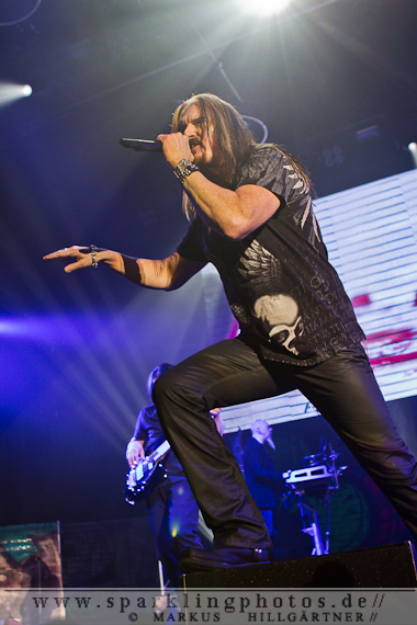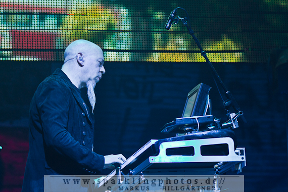 durch alle Altersklassen hindurch, hat. Nach einer kurzen Fahrt mit einem digitalen Taxi führte uns Dream Theater auch hin zum vierten Song: The Looking Glass. Ein durchweg guter Song, welcher auf dem Album direkt hinter The Enemy Inside noch etwas deplatziert wirkte. Live und nach On the Back of Angels kam er aber genau richtig. Es groovte schön und soundmäßig erinnerte es mehr an frühere DT-Tage. Passend zu alten Sounds kam daraufhin dann auch mit Trial of Tears das letzte Stück von Falling into Infinity, dem einzigen Album welches mit Derek Sherinian an den Keyboards entstand. Nach dieser ersten, kurzen Hommage an die alten Tage wurde es wieder sehr modern – mit Enigma Machine spielten Dream Theater das Instrumentalstück ihres aktuellen Albums. Es gab schon lange kein neues Instrumentalstück mehr auf einem DT-Album, zuletzt war es Stream of Consciousness auf Train of Thought. Enigma Machine, wie der Name schon vermuten lässt, warf einige Fragen auf, besonders durch das humoristisch animierte Video im Hintergrund. Sind Keyboarder spielsüchtig? Sind Sänger Verräter? Und was ist mit den Augen von John Myung los? Fragen, auf die uns DT wohl nie eine Antwort geben wird. Im Song selbst war ein kurzes Schlagzeugsolo von Mike Mangini eingebaut, welches technisch einwandfrei und durchweg zum Song gut passend gespielt wurde, aber irgendwie etwas unspektakulär war. Ein kleiner Wermutstropfen bleibt also in dem bis dahin sehr genialen Konzert. Im Anschluss an dieses Stück spielten sie mit Along for the Ride das namensgebende Stück der Tour, welches ohne große Mühen dem Publikum sehr schmackhaft serviert wurde. Abgeschlossen wurde der Konzertblock vor der Pause daraufhin mit Breaking All Illusions, dem, zumindest für mich, einzigen anderen guten Stück von A Dramatic Turn of Events. Insofern also bis dahin eine gelungene Songauswahl, die vor allen dingen eines gezeigt hat: Dream Theater ist viel. Viel Abwechslung, viele Alben und viel Spielfreude.