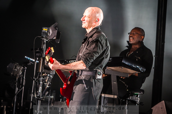 Mit Red rain begann der farbige So-Teil der Show, der selbstredend im roten Licht präsentiert wurde. Sledgehammer, der Song der nach fast 30 Jahren immer noch ein „Hammersong“ ist, wurde durch die süße Tanzchoreo von Peter, Tony und David geadelt. Don’t give up ist wohl eine der schönsten Achtziger Jahre Balladen überhaupt. Im Original gaben Peter Gabriel und Kate Bush ein Ständchen, am heutigen Abend durfte Jennie Abrahamson mit dem Meister singen und sorgte mit der Performance für wohlige Schauer. Auch im weiteren Verlauf der Show gab es viel Schauwerte zu bestaunen, z.B. als Gabriel beim soundtrackartigen Merci Street liegend den Song sang und ihn die Kamera scheinbar zu liebkosen versuchte. Eitle Selbstdarstellung oder Showeffekt? Eher letzteres, da Sir Peter vieles in verschmitzt-sympathischer Art und Weise präsentierte. Bei